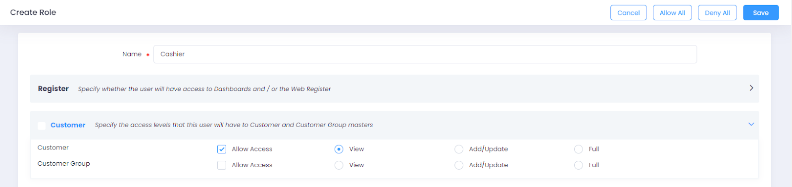 The admin wants the cashier to have access to the customer screen, however, wants him to be able to only view the customer information and not make any edits to it, he can keep the “Allow Access” check box checked and along with that select the “View Only” radio button.