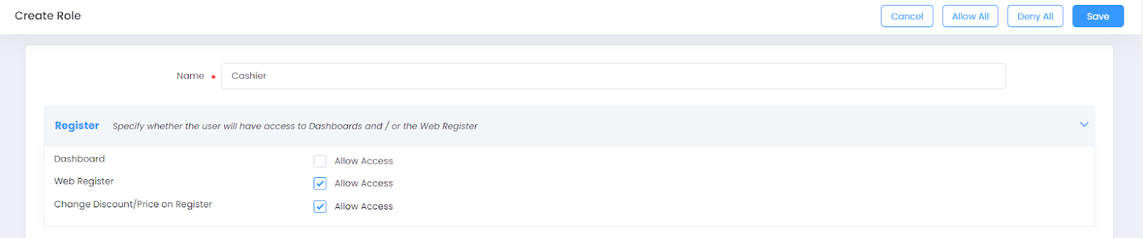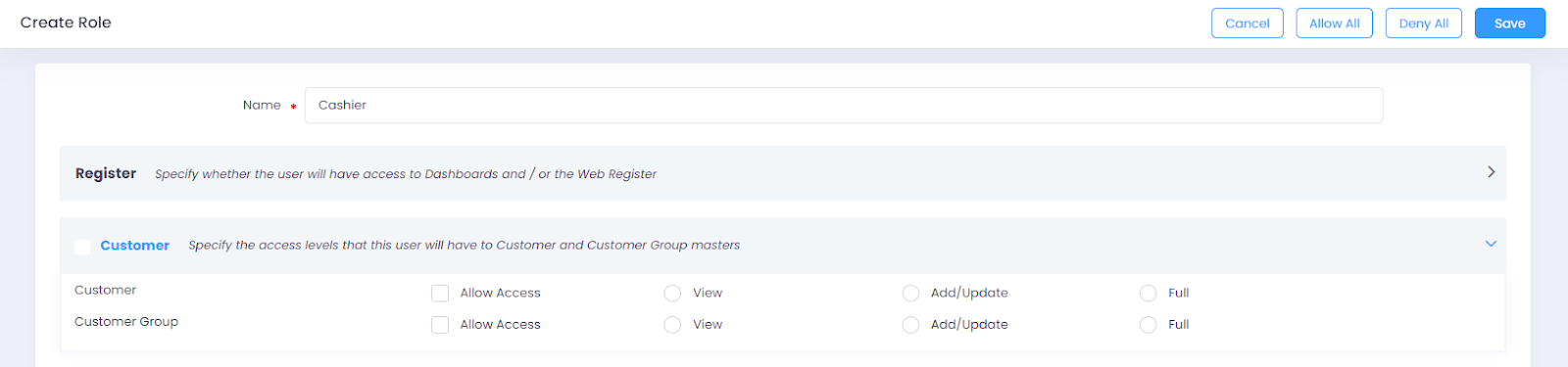 The admin wants to completely restrict the cashier from accessing the customer screen, he would simply keep the “Allow Access” check box unchecked.