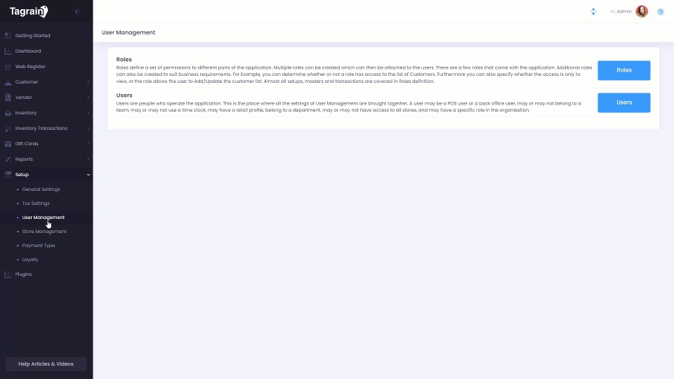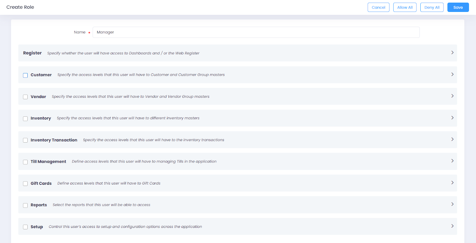 “Roles” refers to a set of permissions which when assigned to a user allows him a defined and controlled access to the application. The purpose of the User Management Role is to have granular level control on what the user can do within the application. It helps in administering the application thereby maintaining security. There are a few roles that come with the application - admin, cashier, and manager. However, additional roles can also be created to suit business requirements.