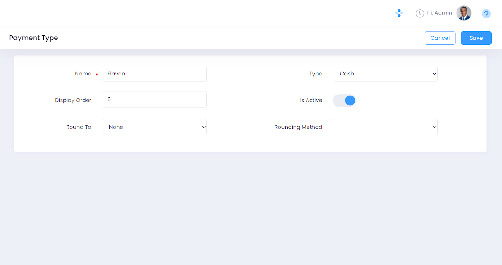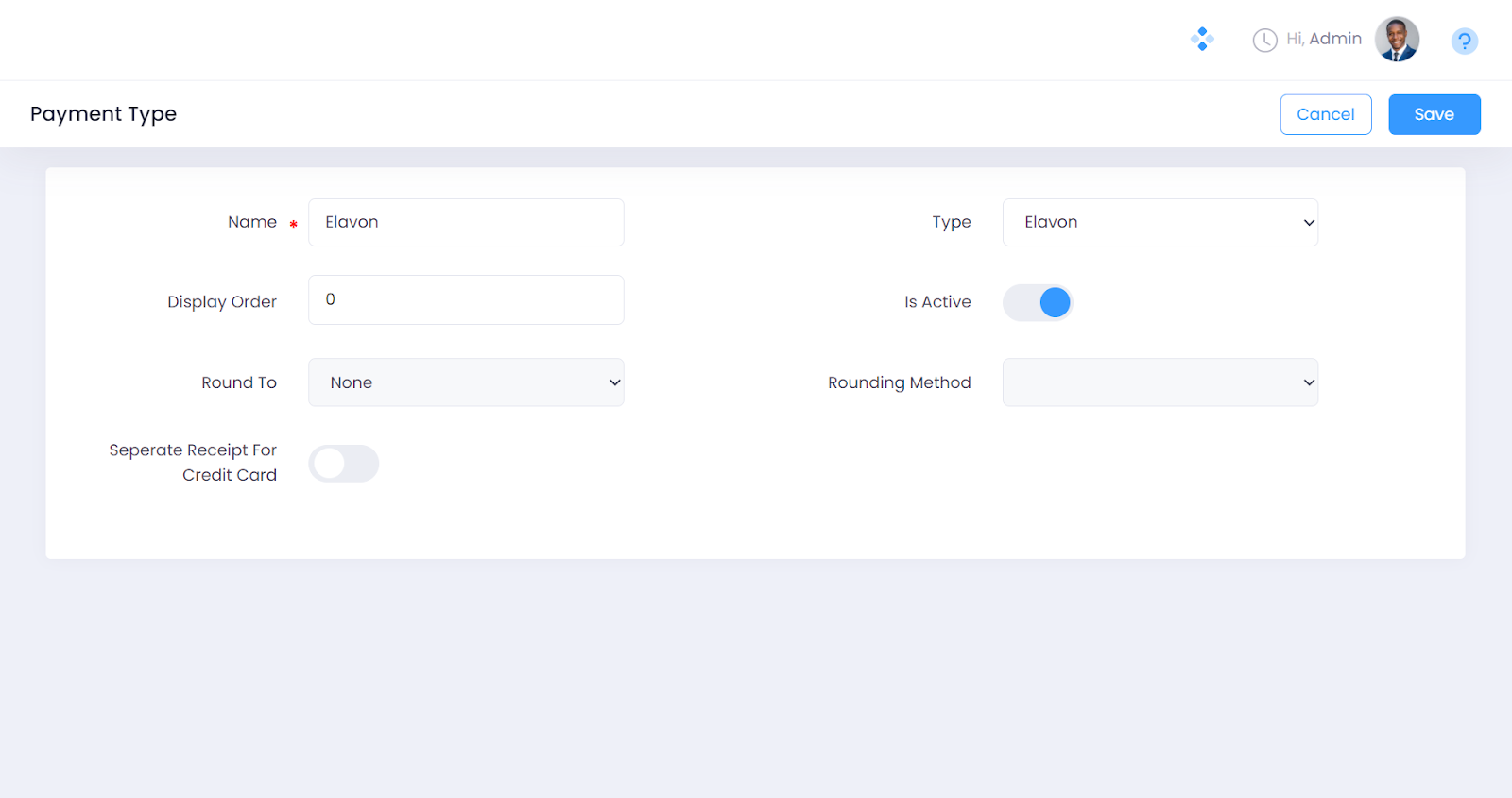 Step 3. Specify the name for the Payment Type. In this illustration, we have specified “Elavon” as the payment type name.