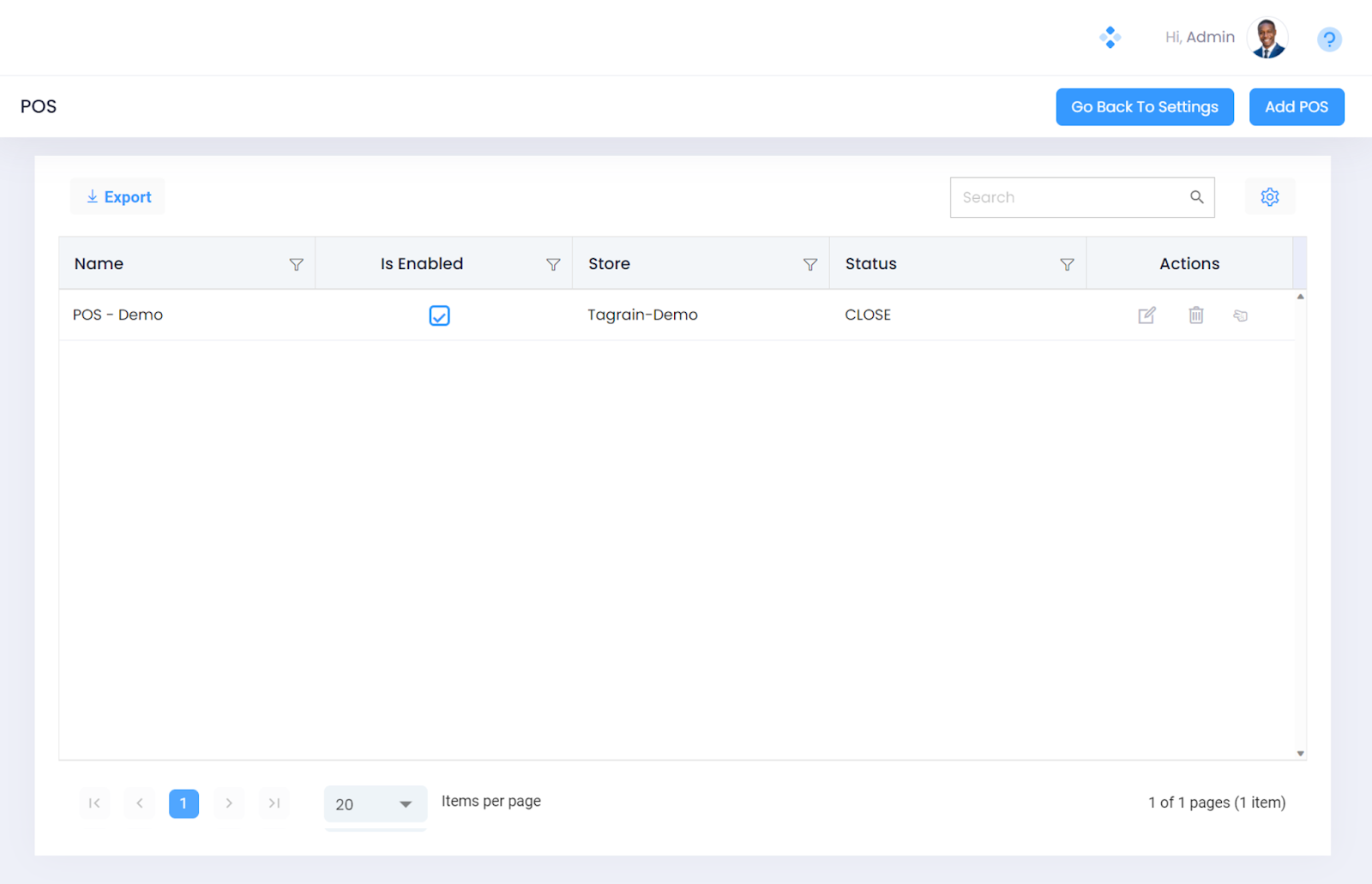 Step 2. Click on the POS button to open the POS List View Screen. This screen displays a list of POS already defined in the application.