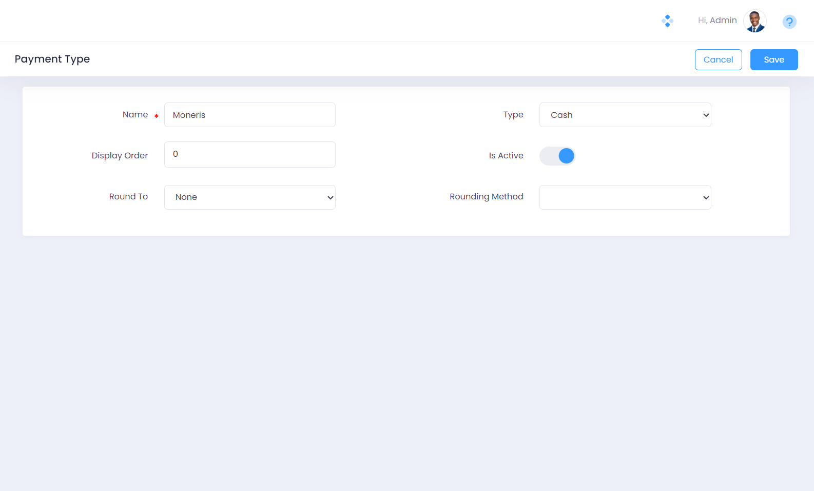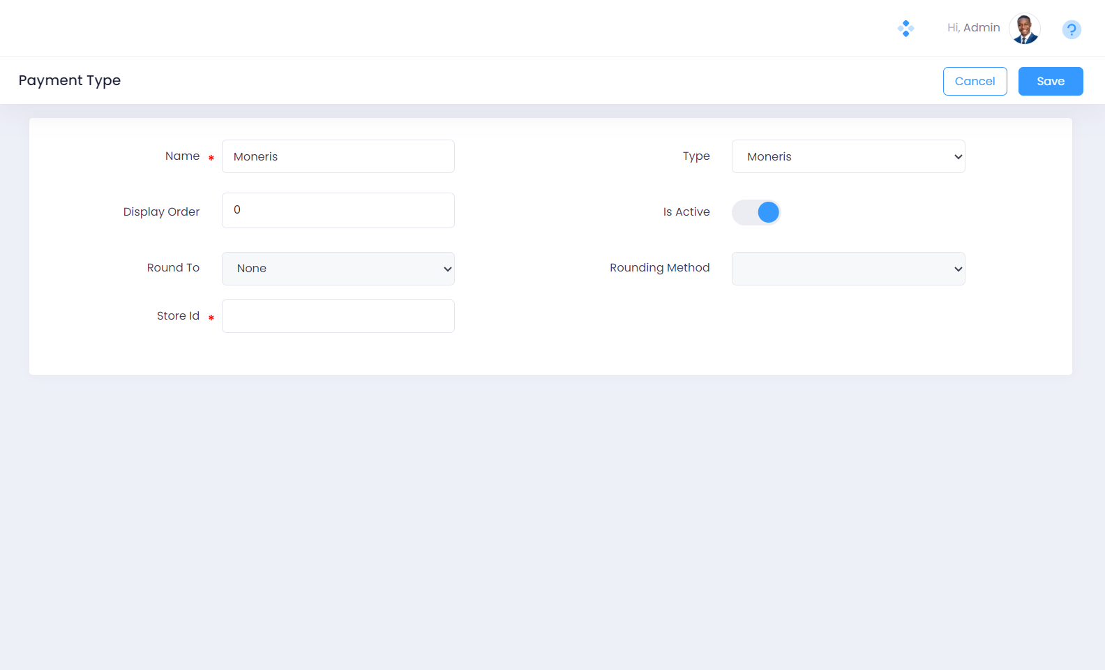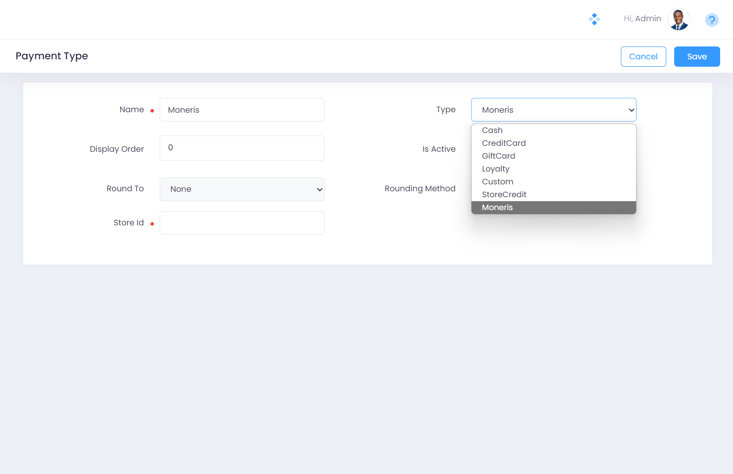 Step 3. Specify the name for the Payment Type. In this illustration, we have specified “Moneris” as the payment type name.