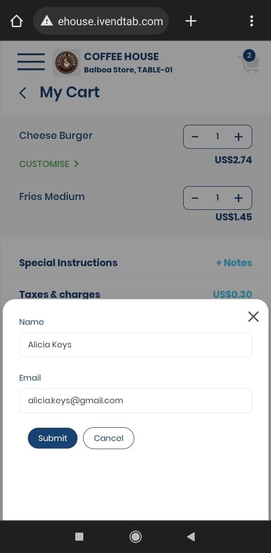 Yes, when you tap on the Place Order button to place an order, a customer registration pop up screen appears. This screen prompts you to specify your details like your name, email, and phone number. This actually helps deliver the order to the correct person.