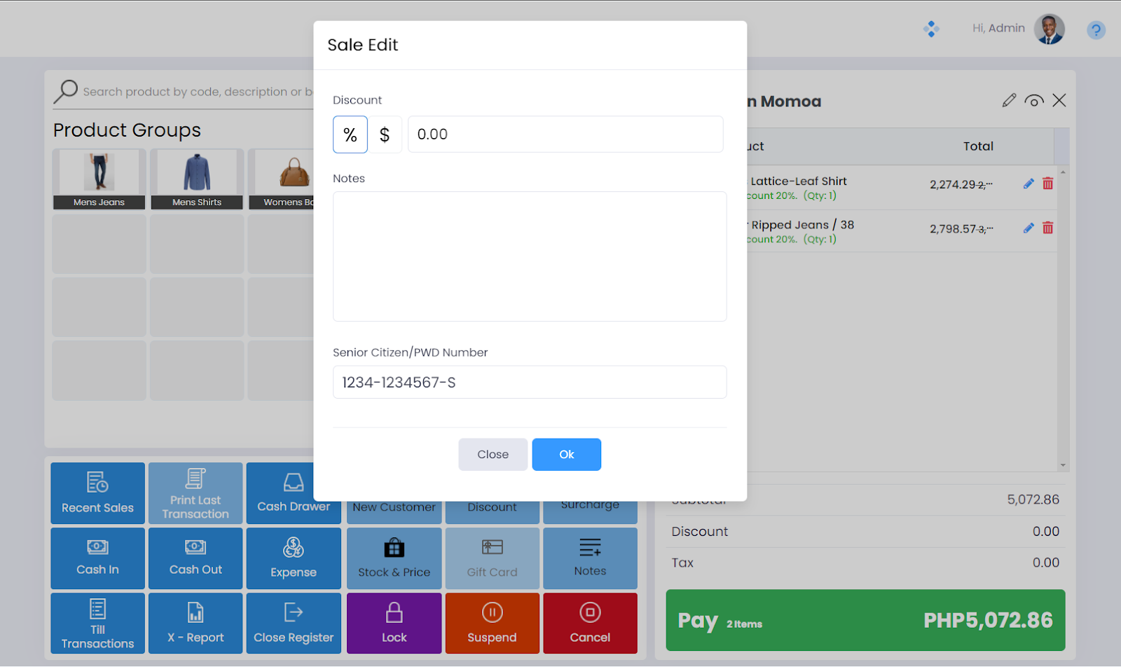 The PWD Citizen Discount and the Senior Citizen Discount is applied automatically when such a customer is selected on the POS terminal.
