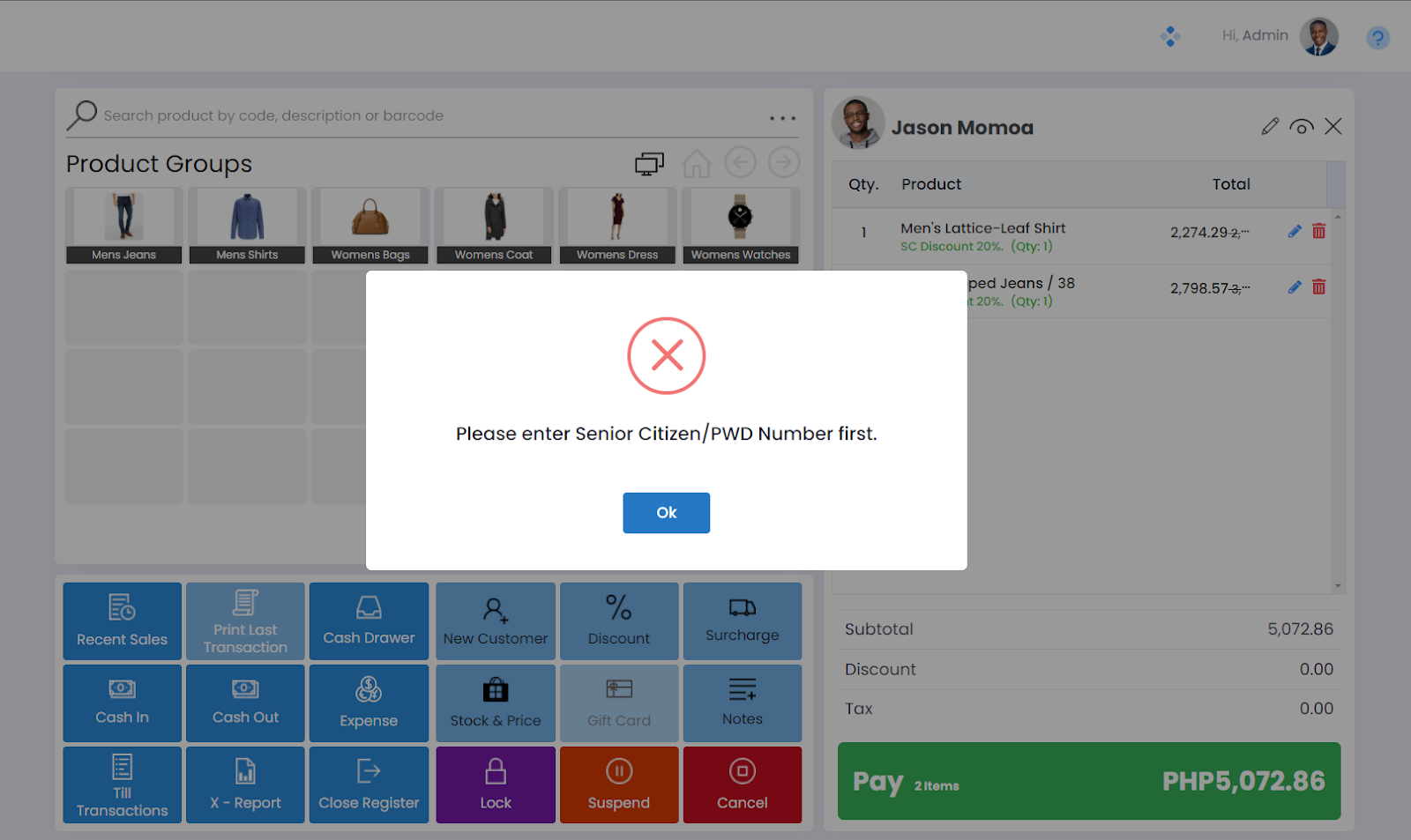 The PWD Citizen Discount and the Senior Citizen Discount is applied automatically when such a customer is selected on the POS terminal.