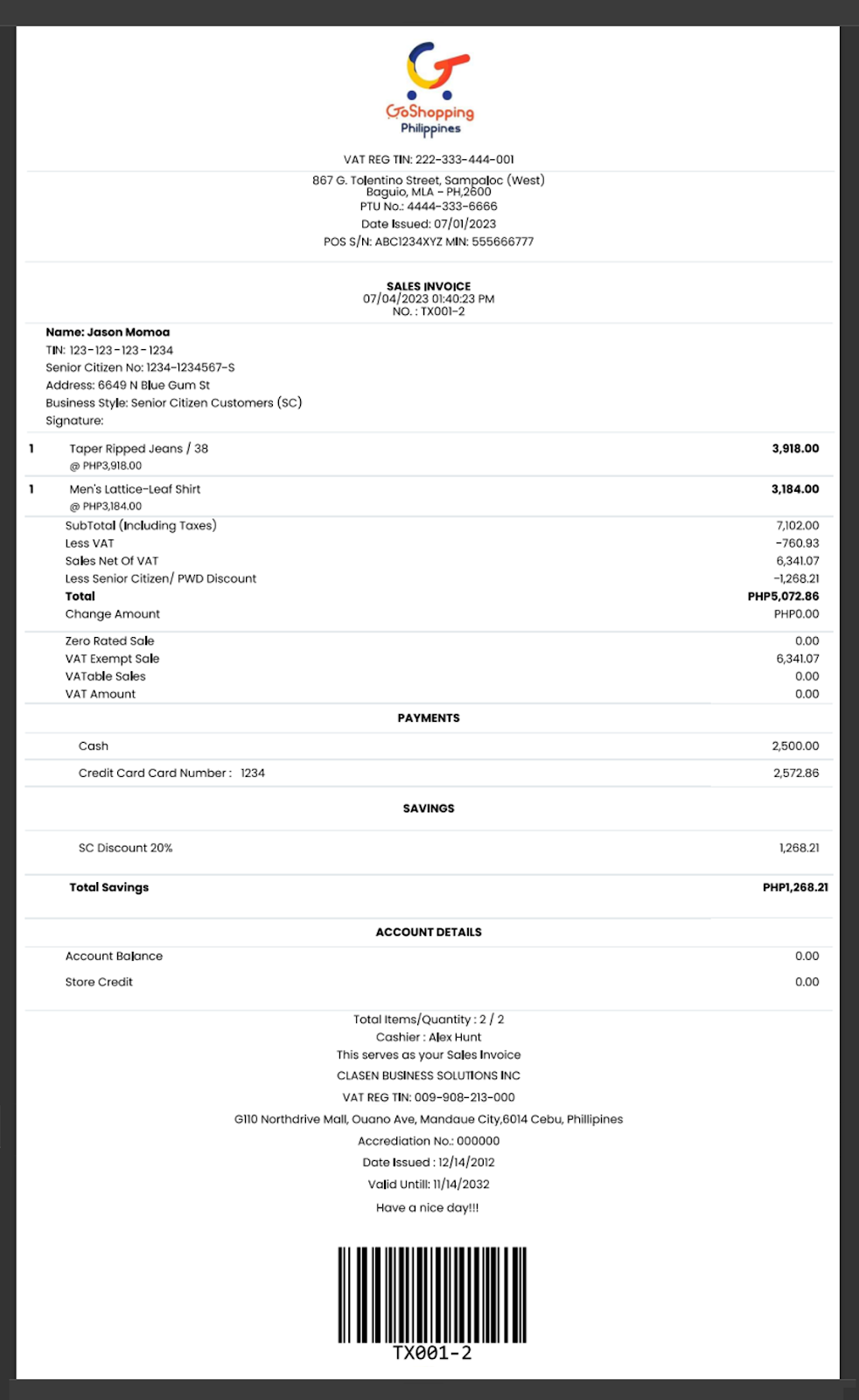 A sample (consolidated) sales invoice / transaction receipt is pasted below for your reference.