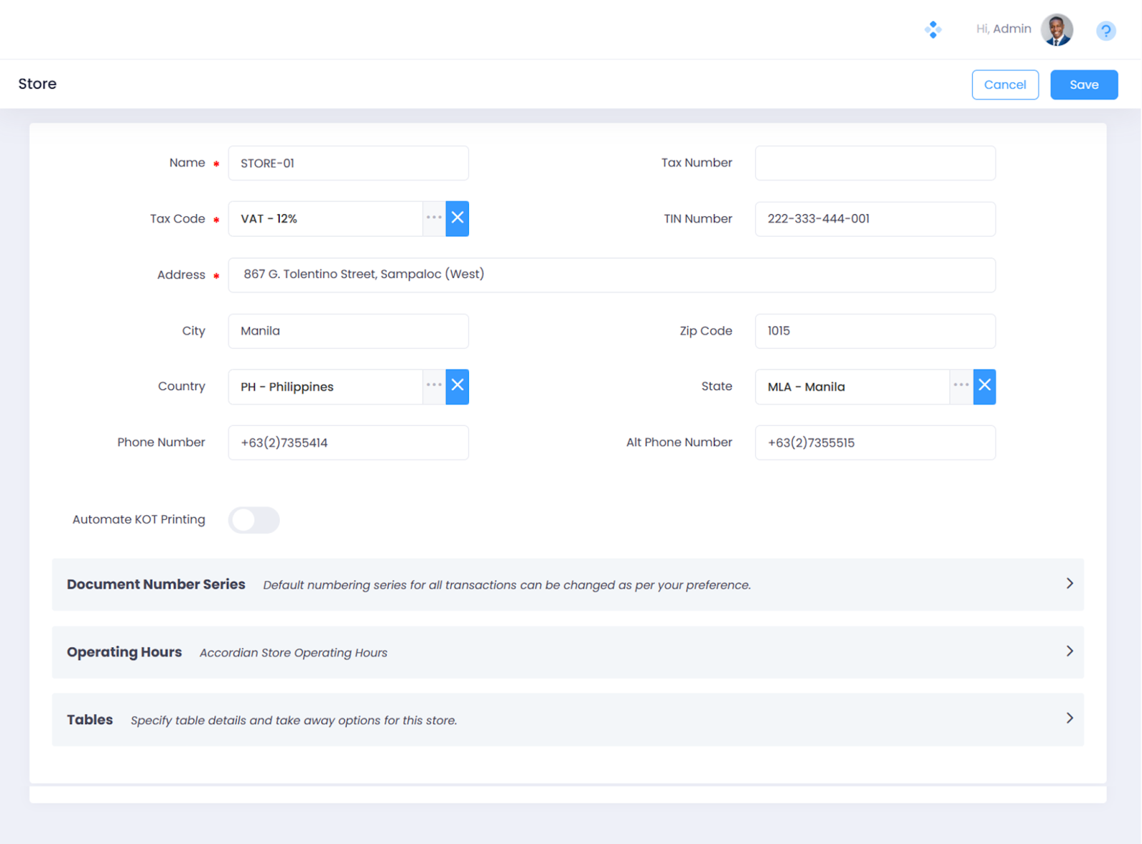When you flip the Enable BIR switch ON, an additional TIN Number field appears on the Store’s setting page. This is a text field where you can specify the TIN Number.