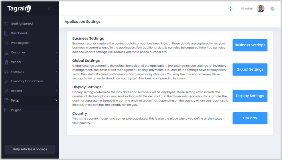 Navigate to Home > Setup > General Settings to open the Application Settings page. All the settings pertaining to the application - Business Settings, Global Settings, Display Settings, and Country Settings can be accessed from this page.