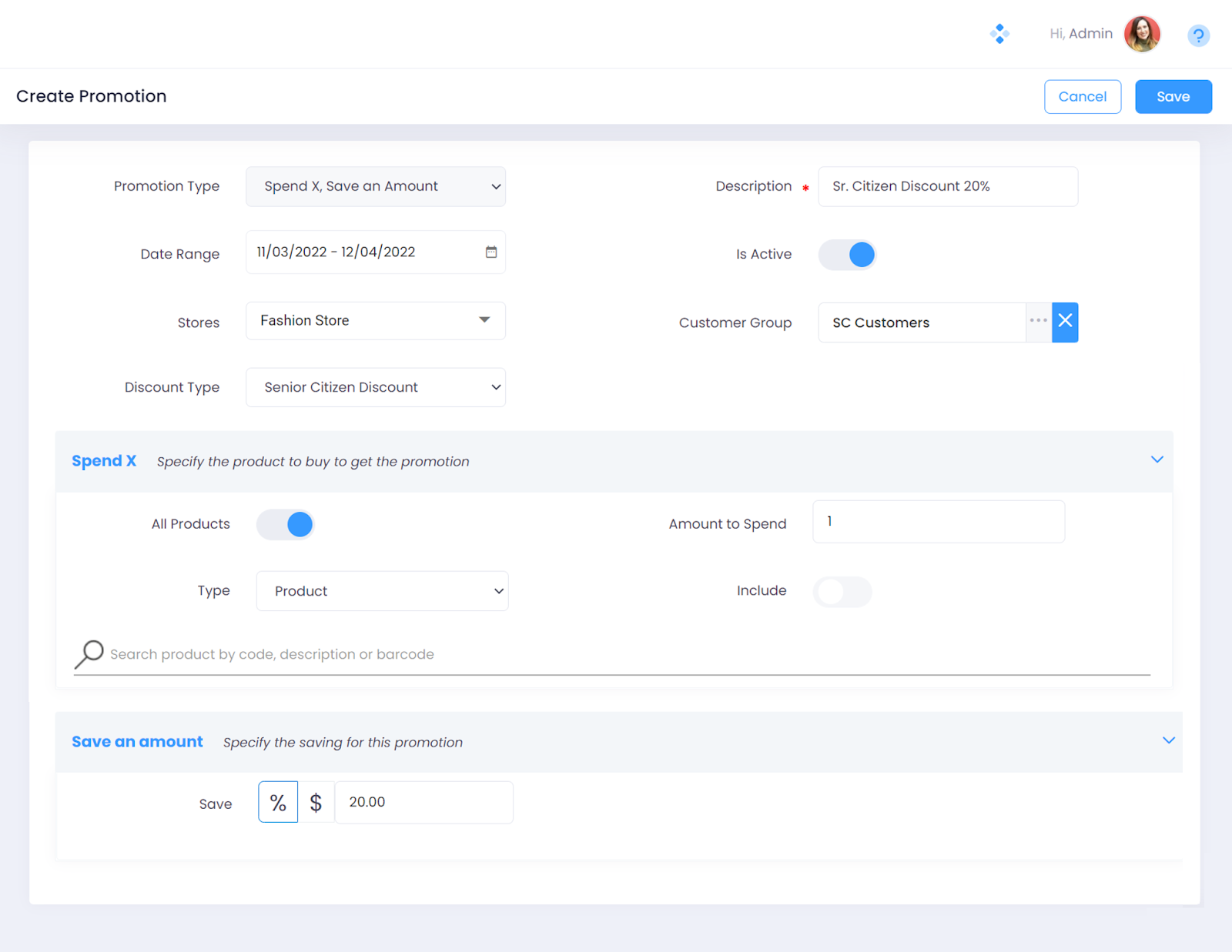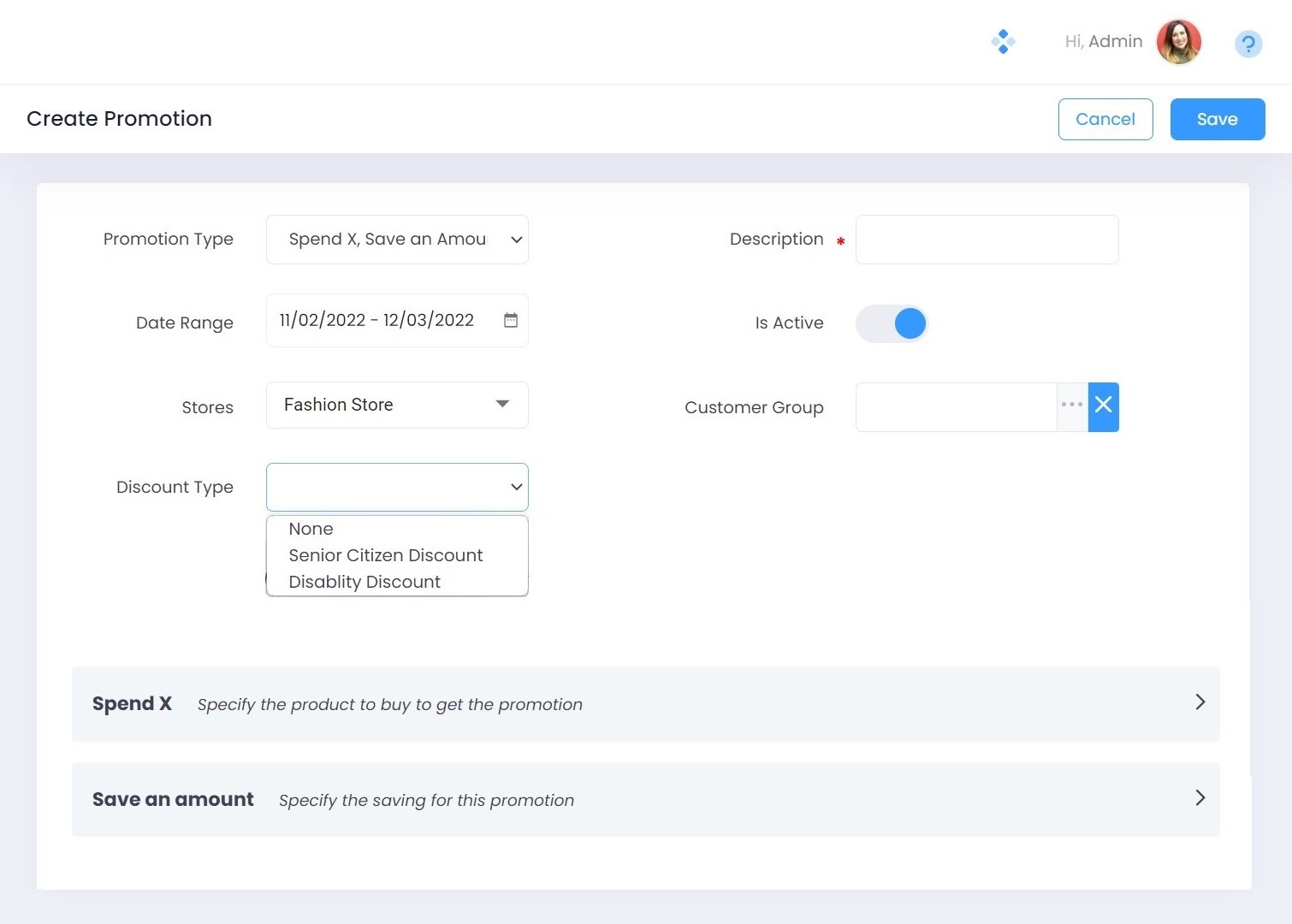 Please Note - The procedure to define Promotions remains the same for all the promotion types except the Spend X | Save an amount Promotion