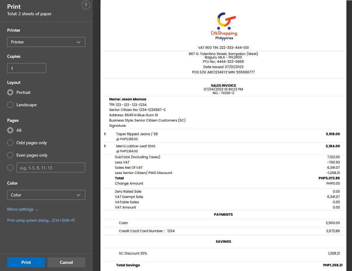 A sale transaction receipt is printed at the end of every sale / sale refund transaction. The receipt for a transaction where a Senior Citizen promotional discount was applied would be like the screenshot below.