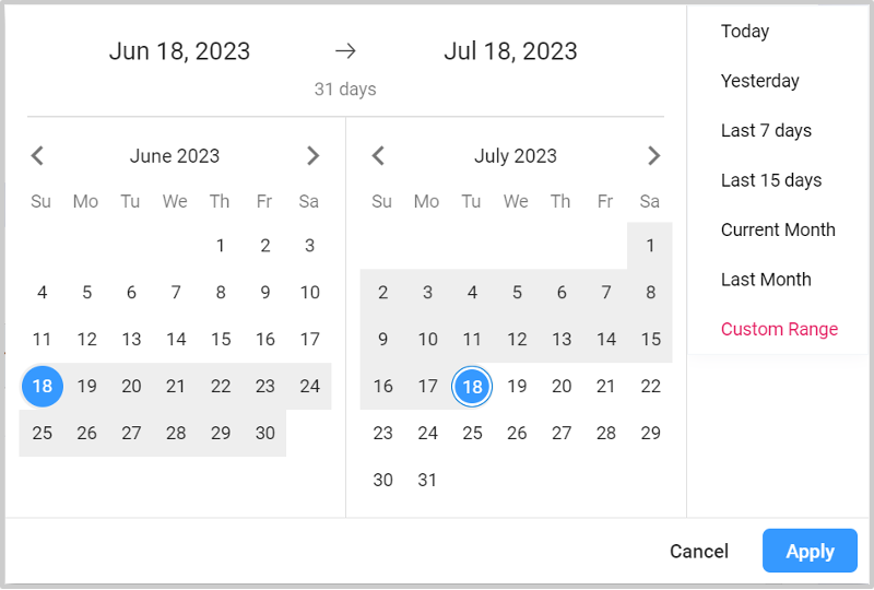 You can either click on the date itself to pick the Start Date and the End Date OR use the Date Template to pick a date range from the menu displayed on the right. You can even define a Custom Date Range.