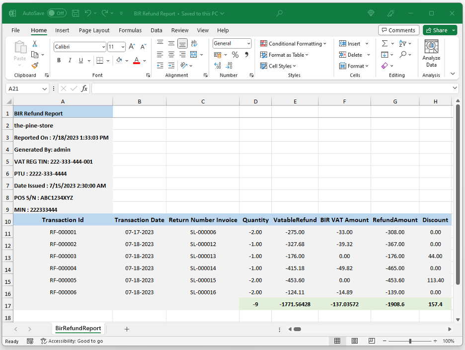 BIR Refund Report is specific to BIR (Bureau of Internal Revenue) in the Philippines. This report is used for reviewing and monitoring the refund sale transactions done on a POS terminal.