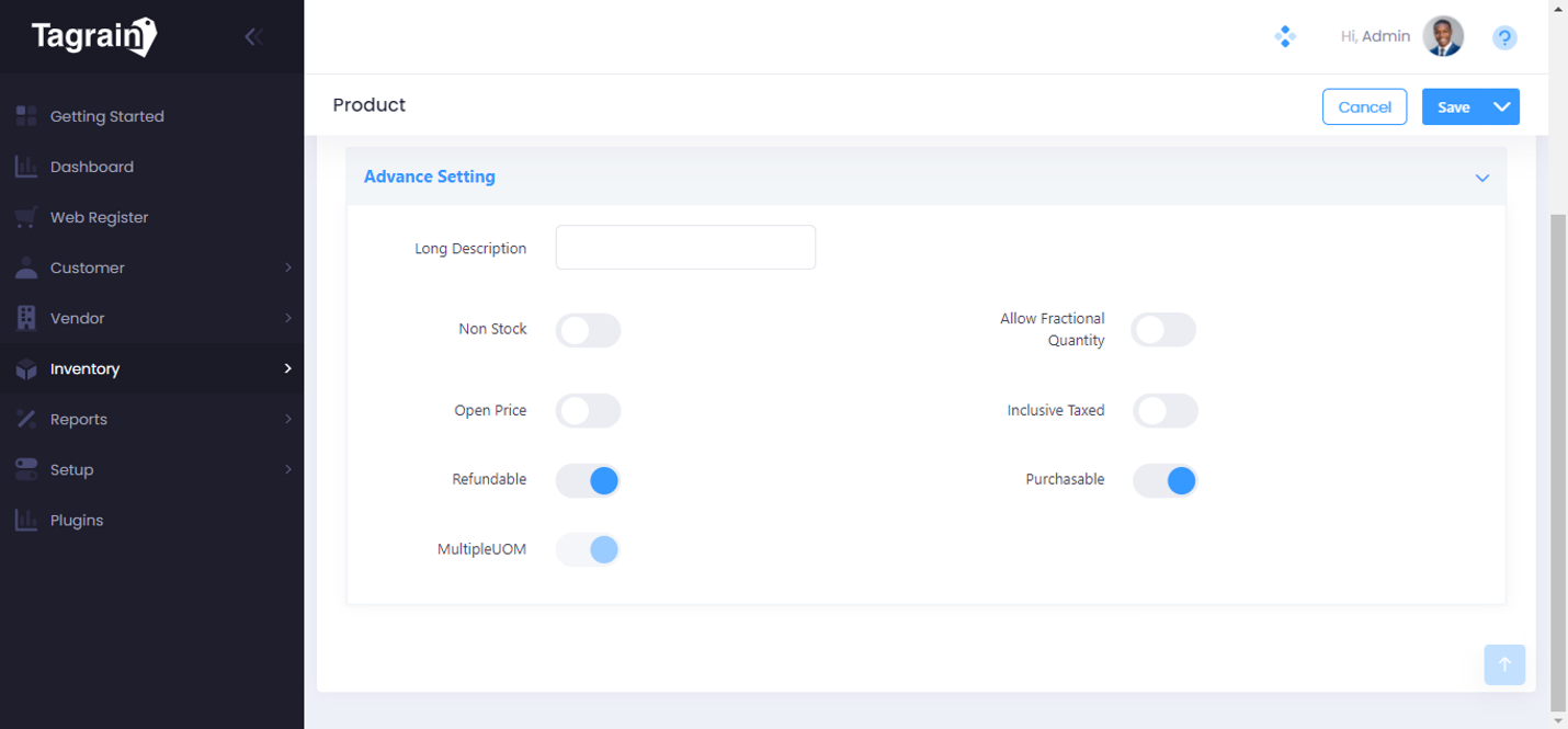 Since the “Multiple Units of Measurement” Plugin was purchased and activated, the application allowed us to switch ON the Multiple UoM setting under “Advance Setting”.