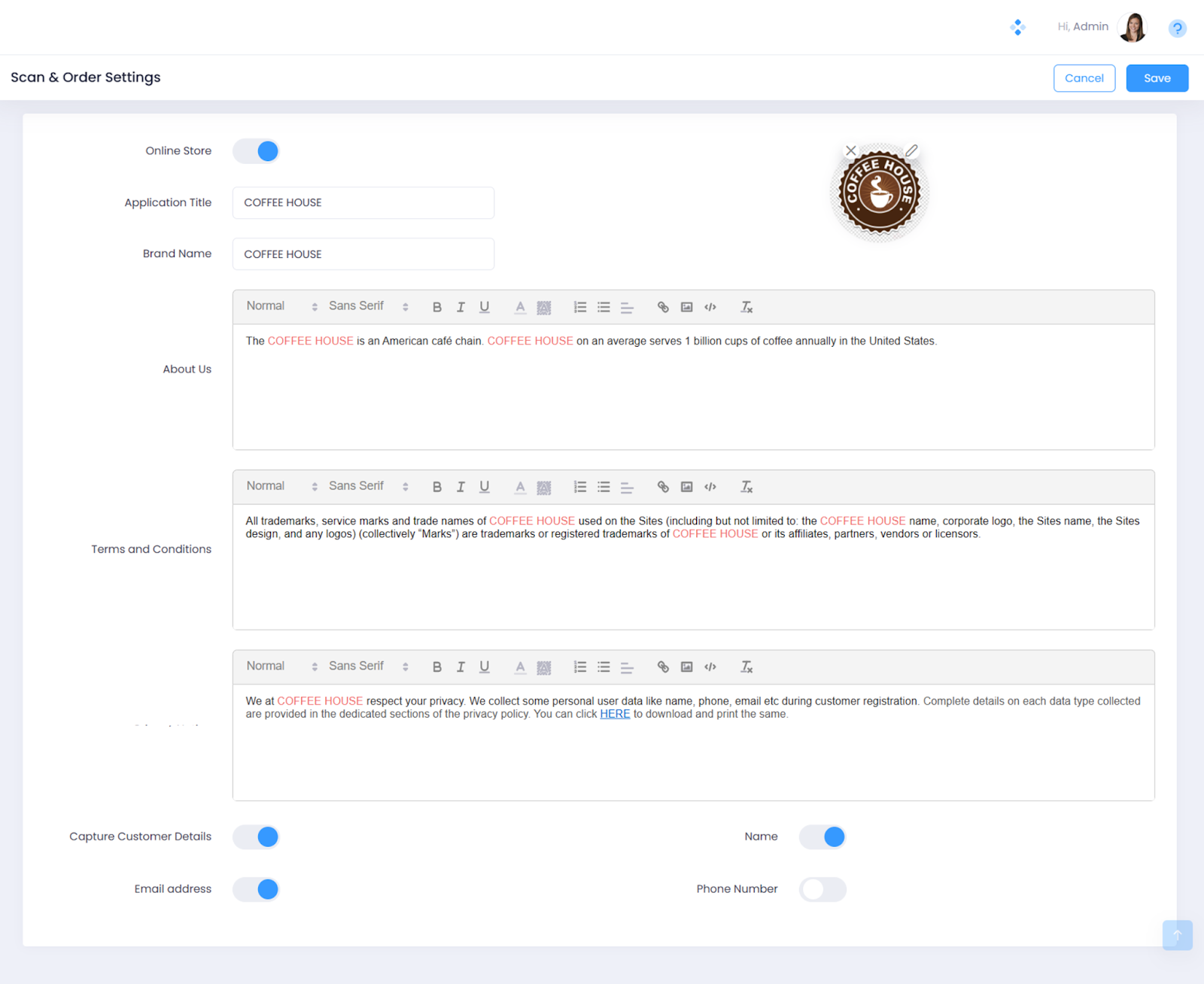 Once the Scan and Order Plugin is activated, an additional Scan and Order Button appears on the Application Settings page. You can click on this Scan and Order button to open the Scan and Order Settings page. All the settings pertaining to the mobile responsive website can be configured from this page. From Brand Logo to capturing customer information, it lets you control everything related to the landing page.
