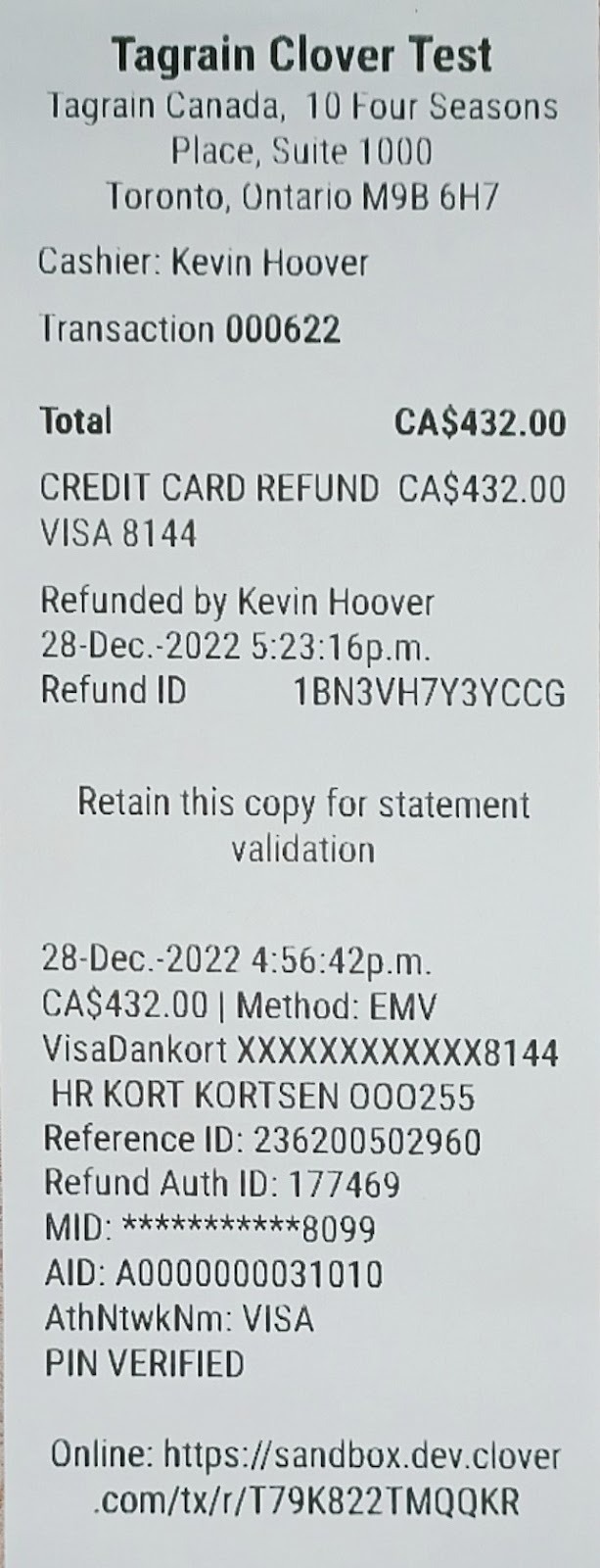 Depending upon the selection made, a credit card refund receipt is printed on the Clover Connect device.