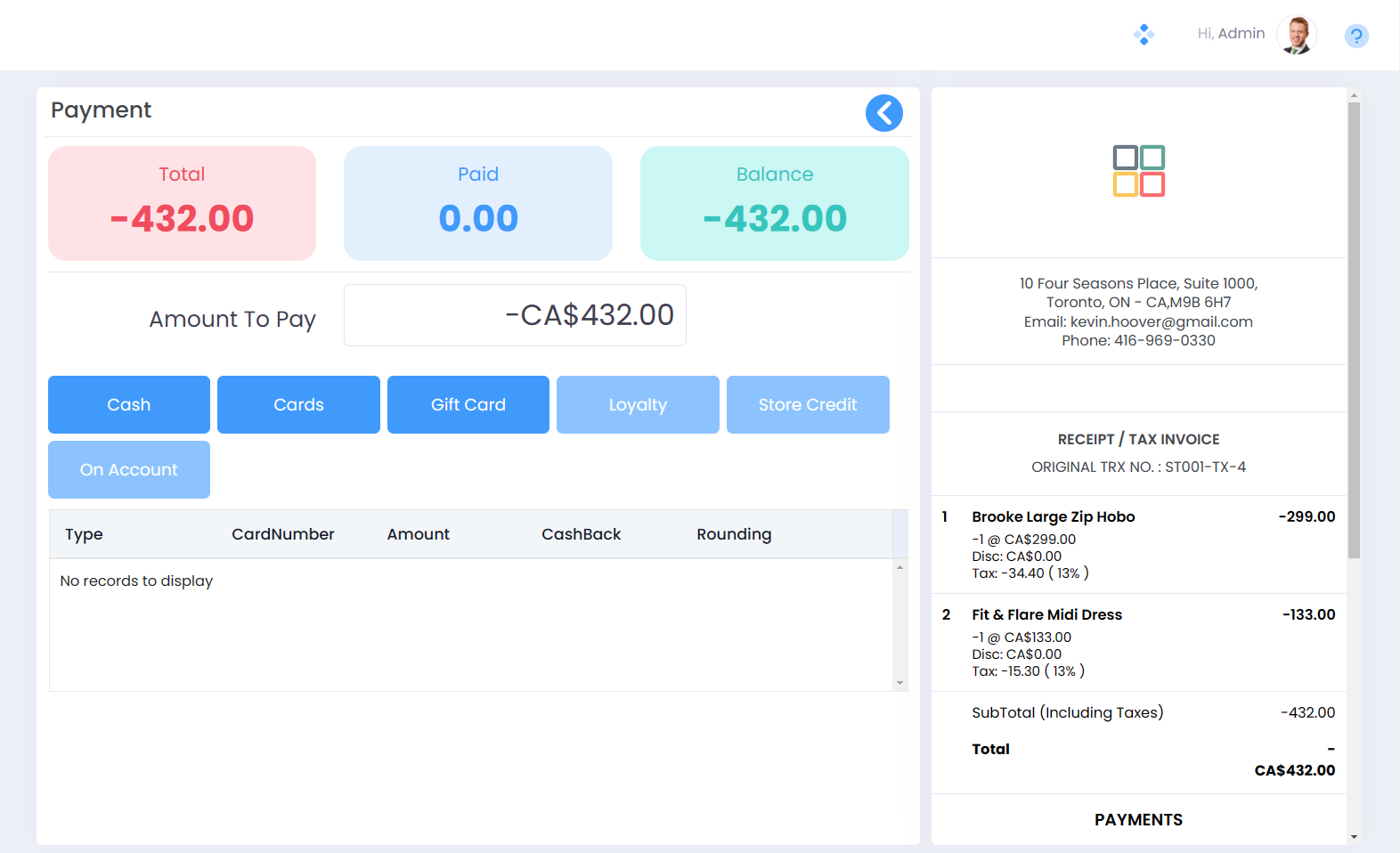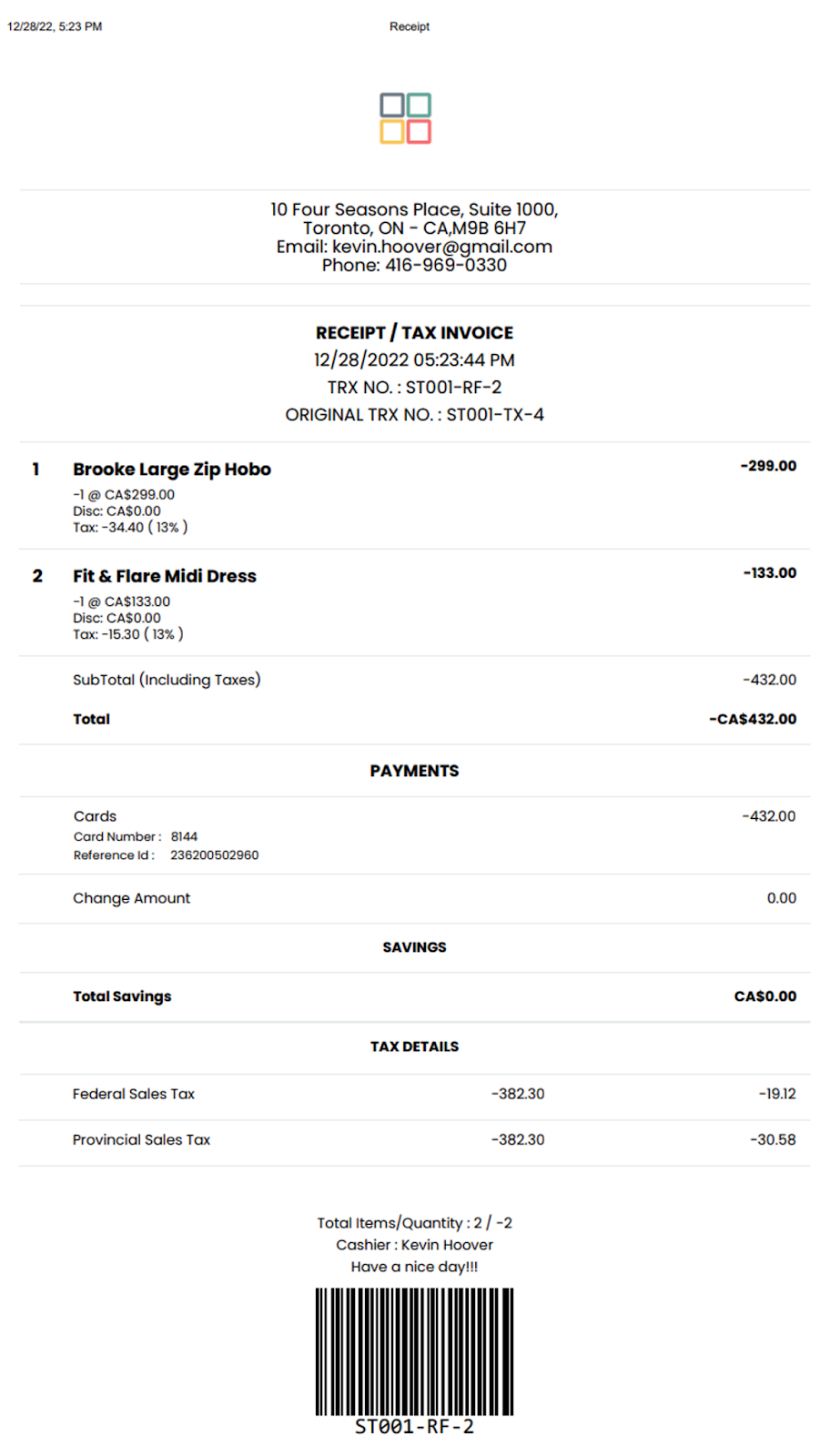 Click OK to complete the refund. Upon successful refund a transaction receipt is generated which can be printed.