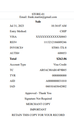 The screenshot below depicts that a payment of $263.06 was made using the Elavon Payment Device and the balance $300 now reflects as the Amount To Pay.