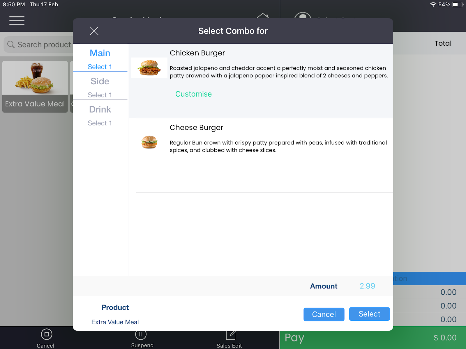 Step 2. Click on the Main sub menu on the side pane. It will display the Main Element that you may have defined for the Extra Value Meal combo. Click on the Customise hyperlink. This will open the modifier selection popup screen. All the modifiers that you may have defined for your Combo Meal would appear here.