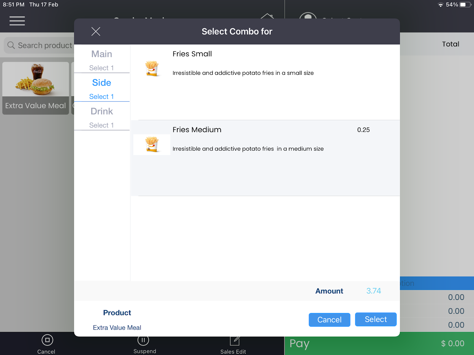 Step 4. Click on the Side sub menu on the left pane. It will display the Side Element that you may have defined for the Extra Value Meal combo. In this example, only one Side can be selected. By default small fries are selected. You can select medium fries which will add an additional 0.25 to the bill. Let’s say we select Medium Fries. This adds an additional $0.25 to the total.
