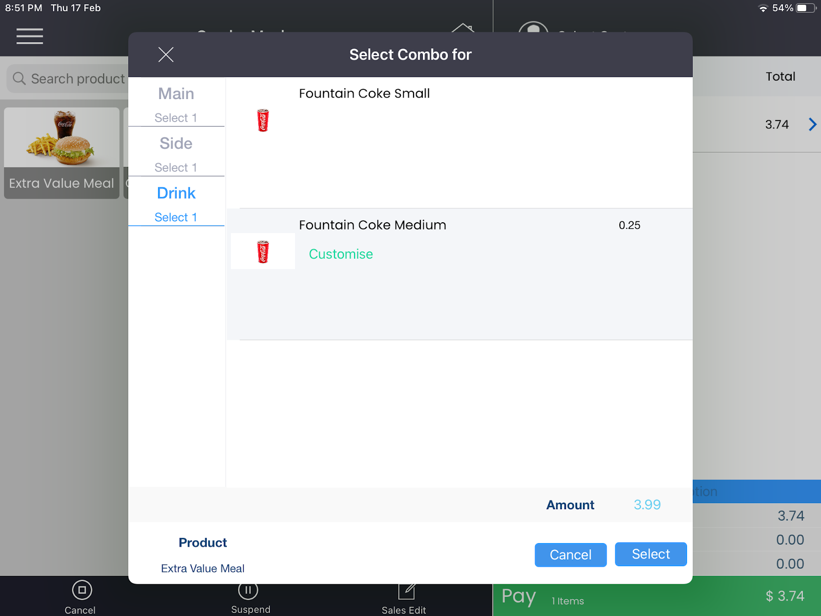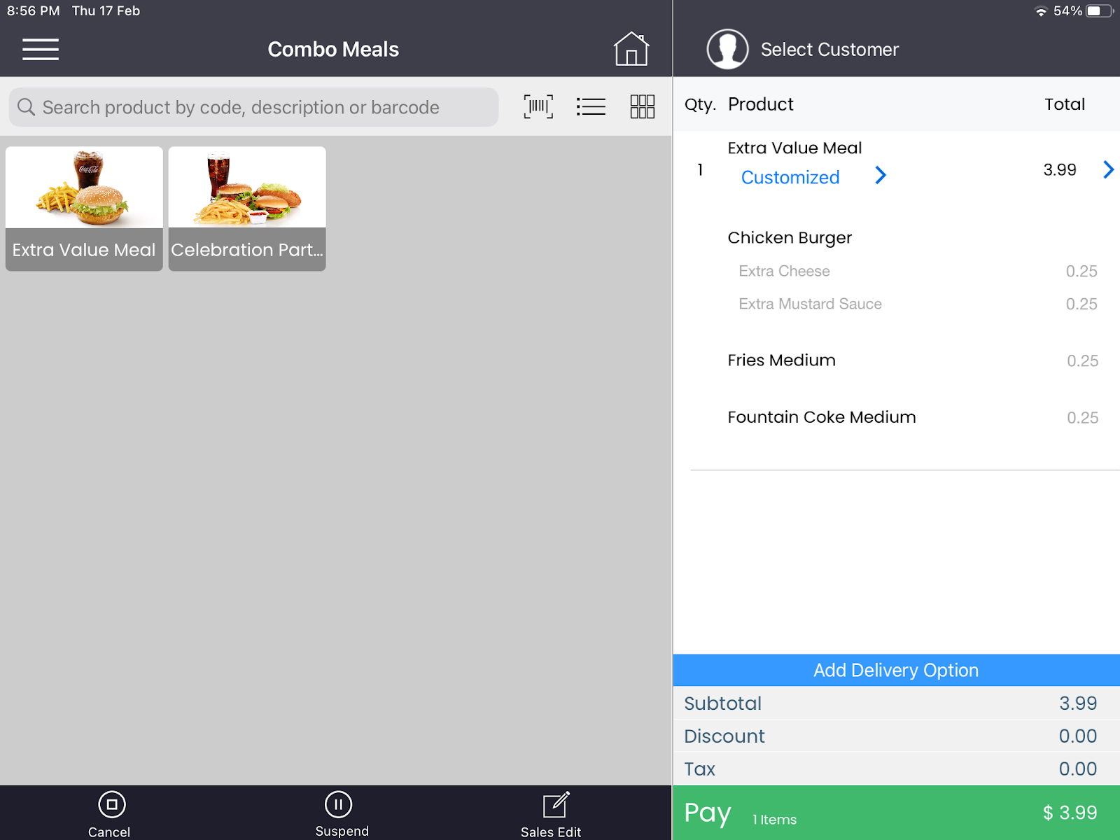 Step 1. On the Point of Sale screen click on Extra Value Meal.