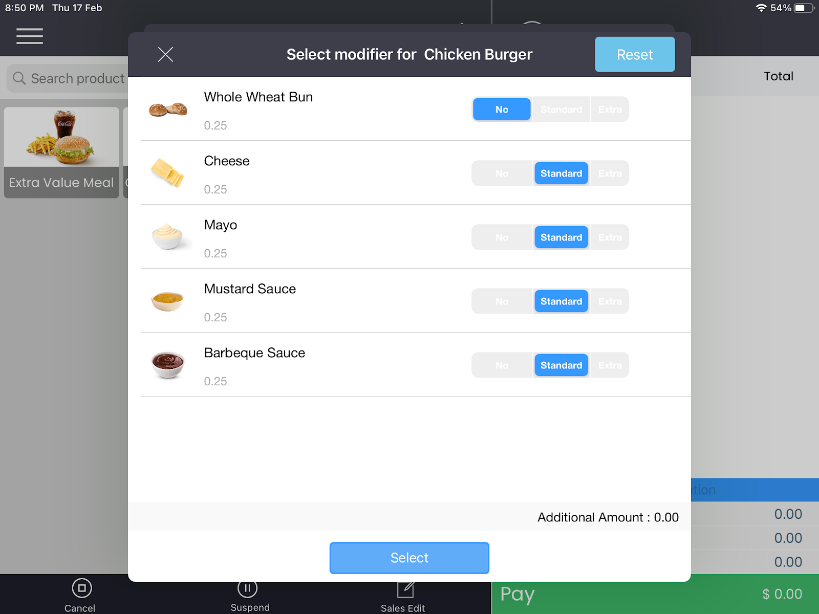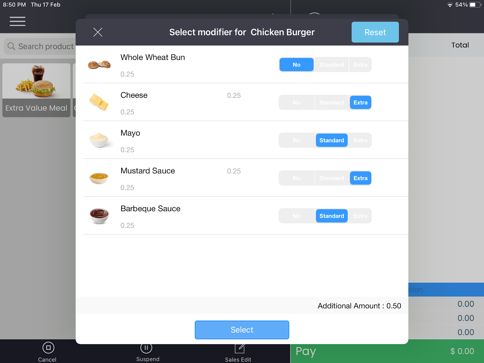 Step 3. Select the desired “Modifiers”. In this article, for demo purposes, we have opted to go in for some “Extra” Cheese and “Extra” Mustard Sauce.