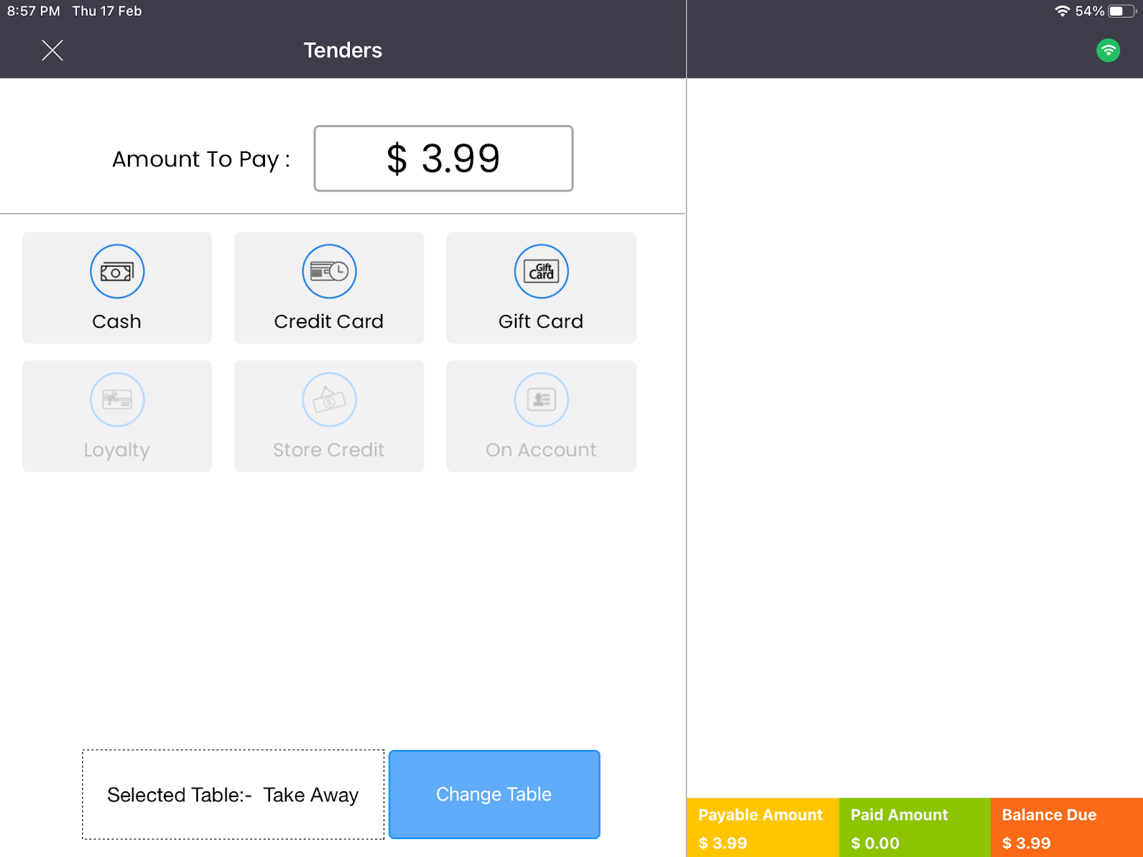 Step 6. Click Pay to proceed to the Select Table screen. Depending upon the type of order - dine in or take away, you can select a Table Type.