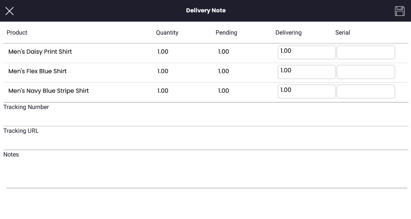 Whether you select “Mark as Picked” OR “Mark as Delivered”, it will open the “Delivery Note” screen.
