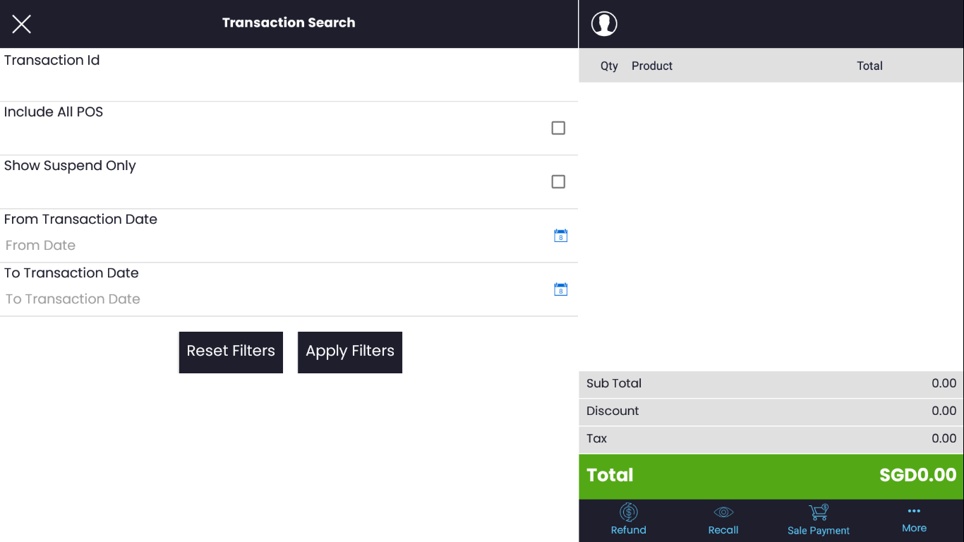 Step 1. Click on the “Recent Sales” sub-menu on the Tagrain App for Android. This will bring up the “Transaction Selection” screen.