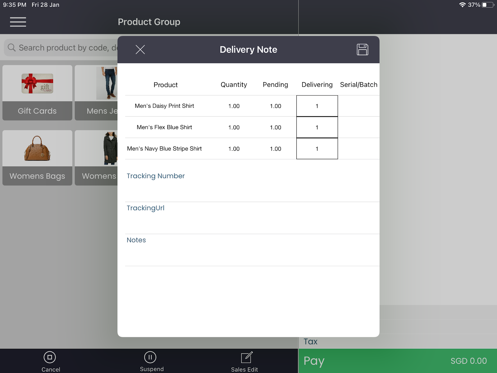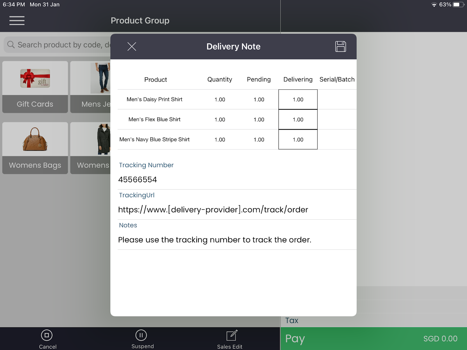 The “Delivery Note” screen when the Delivery Type was selected as “Home Delivery”. You must input any Tracking Number or Tracking URL in this case. See: Home Delivery of customer orders using the Tagrain App for iPad.