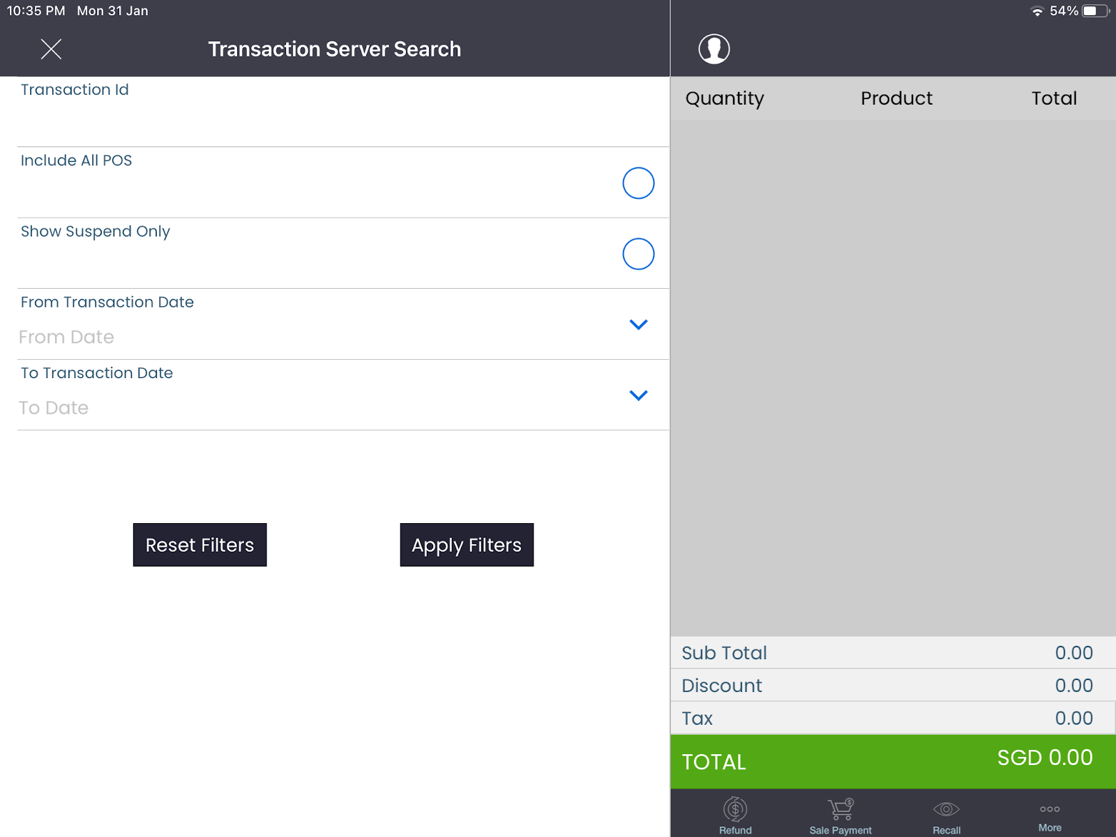 Step 1. Click on the “Recent Sales” sub-menu on the Tagrain App for iPad. This will bring up the “Transaction Selection” screen.
