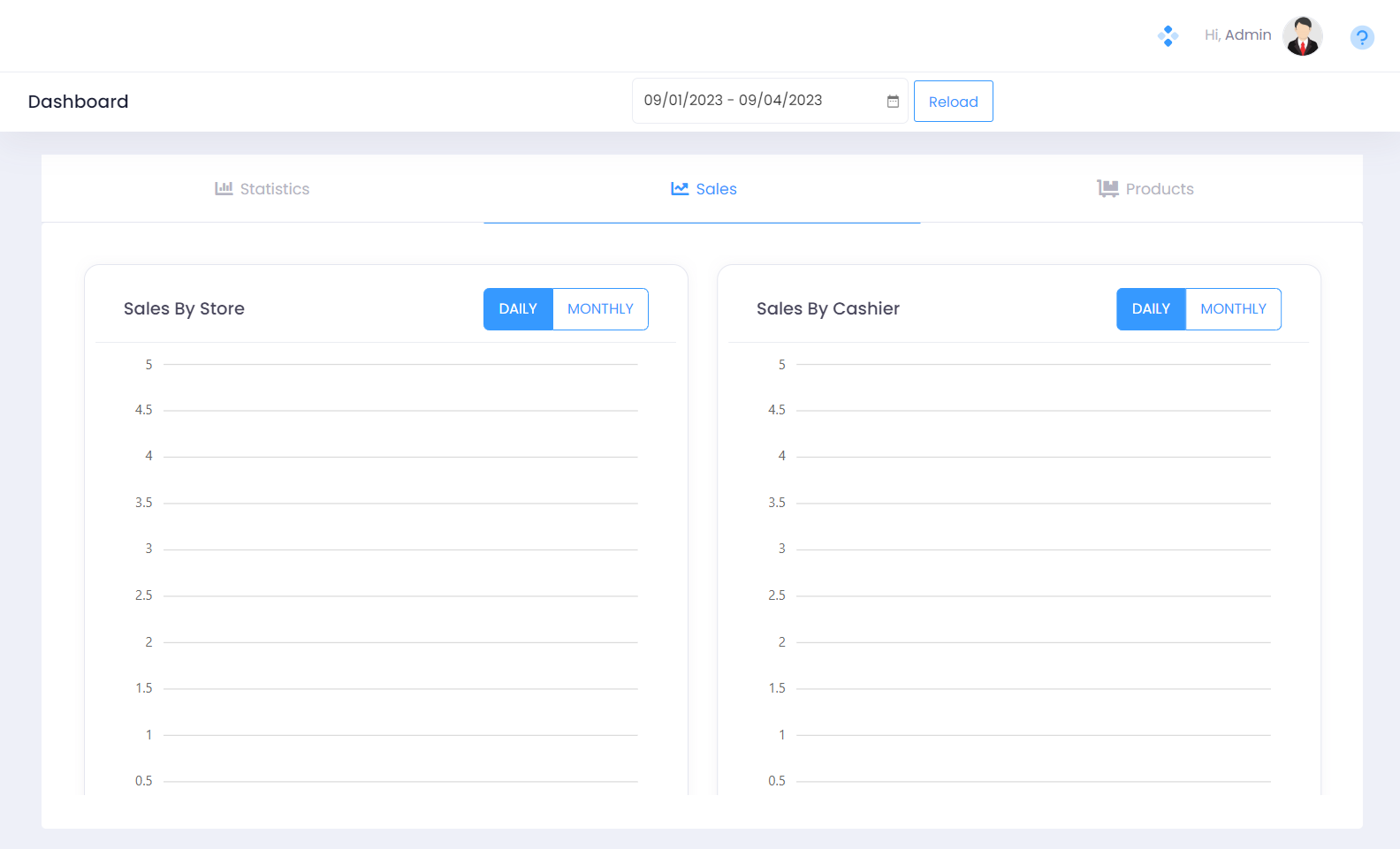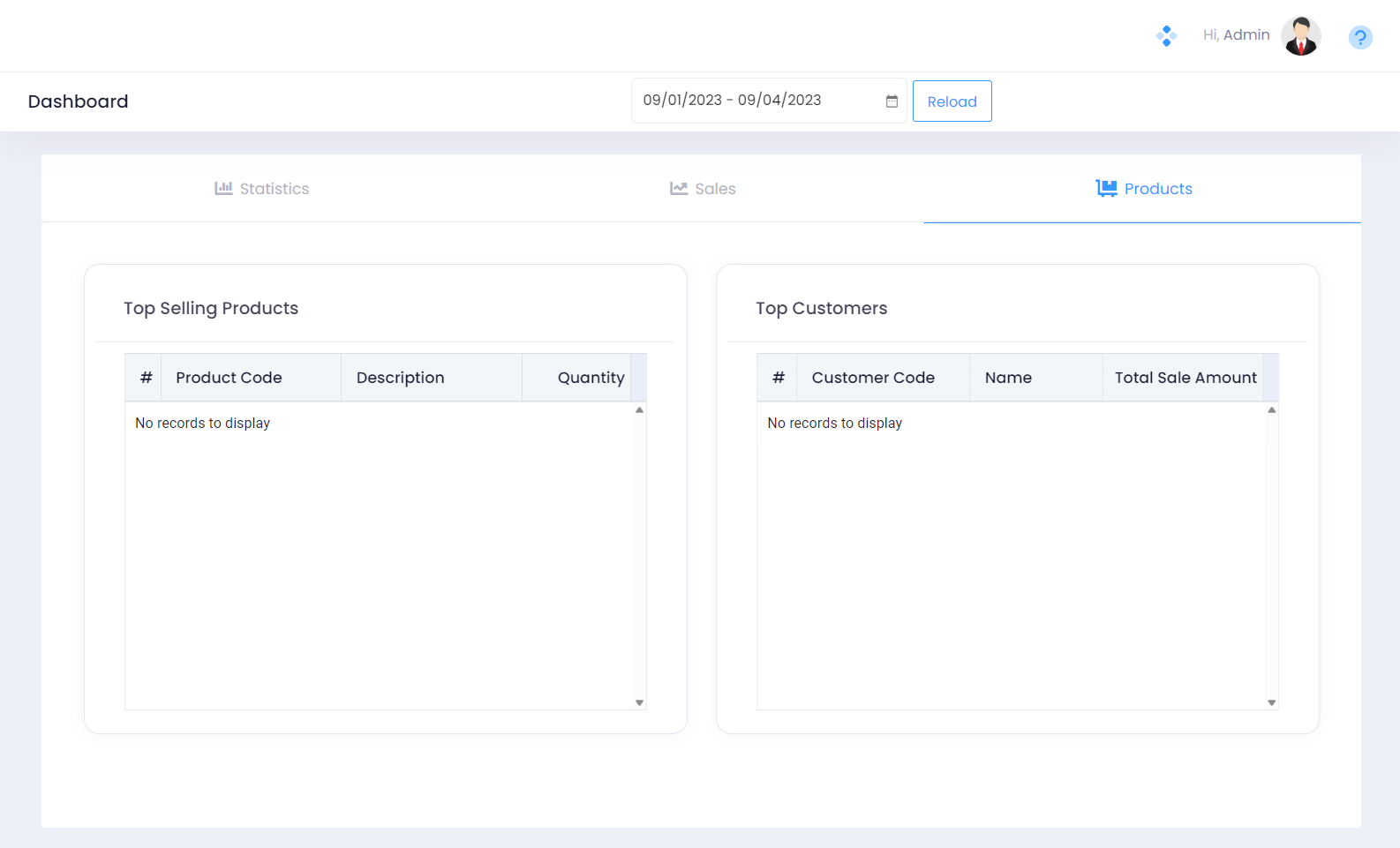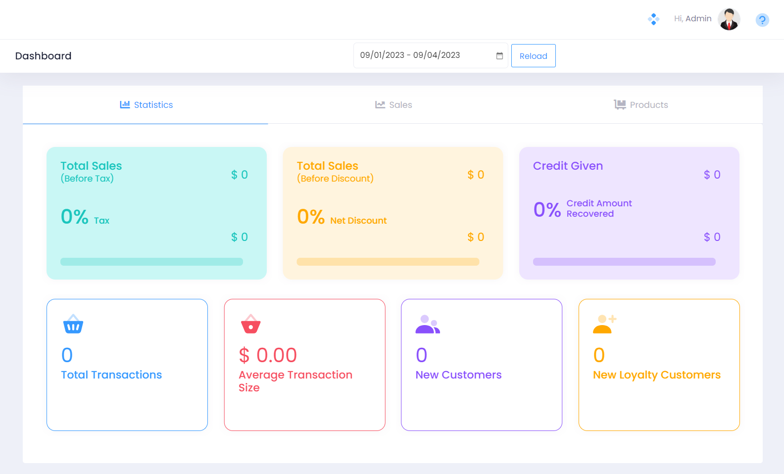 Dashboard is the information management tool that visually tracks, analyzes, and displays key performance indicators (KPI). It displays business performance in the form of statistics and reports. It is categorized into three main display areas for performance indicators namely Statistics, Sales, and Products. Each of these display areas have been further categorized into widgets. These dashboards can be generated for a specific date range of choice.