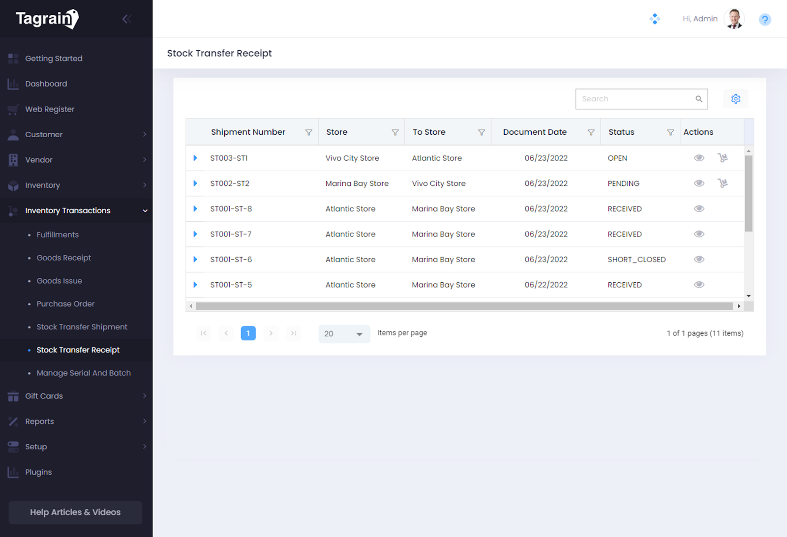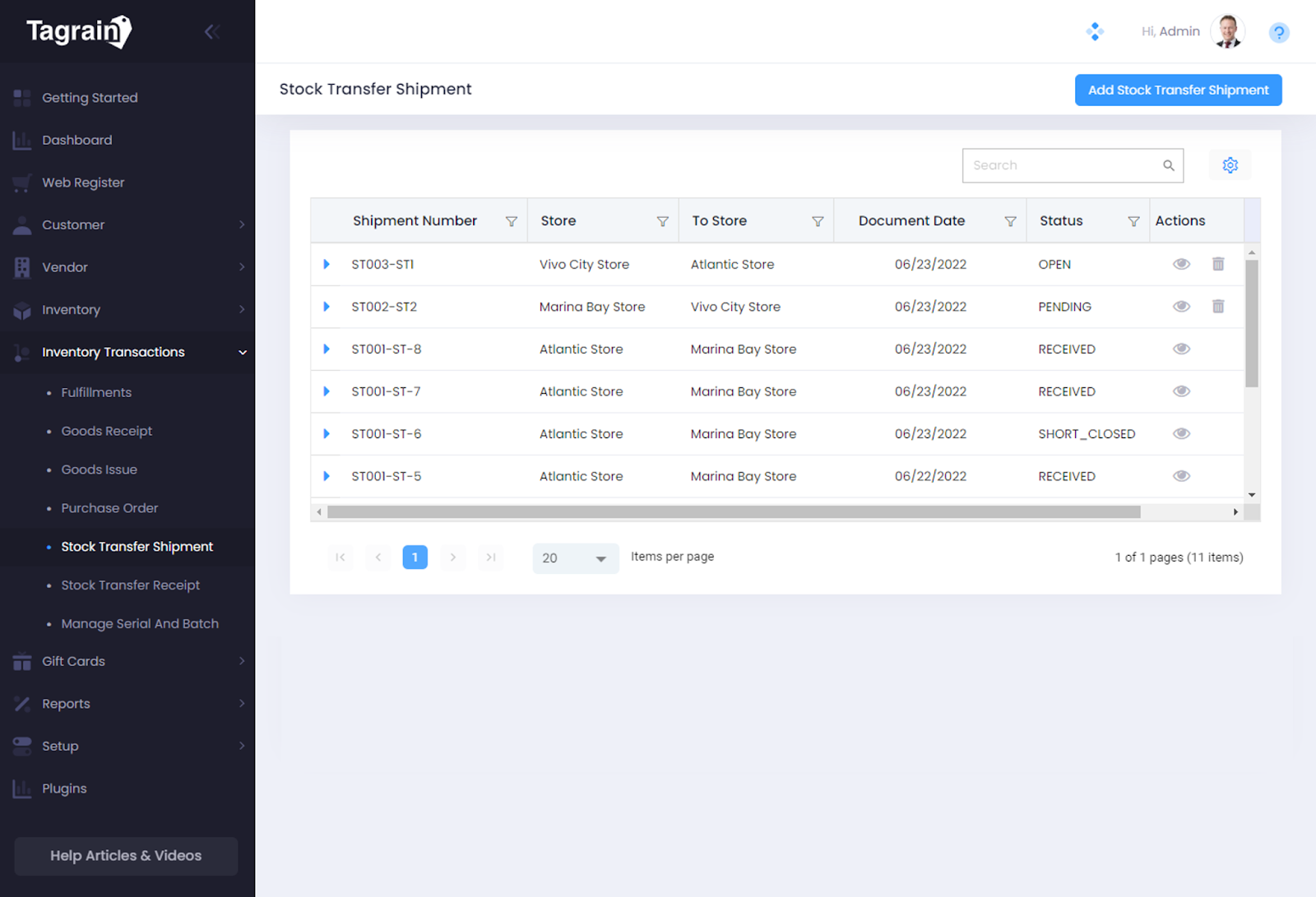 Stock Transfers are common in a multi-store setup. Tagrain facilitates Stock Transfers. However, to benefit from the Stock Transfer feature, the Stock Transfer and Inventory Management Plugin must be activated. Stock transfers in Tagrain is a two-step process that involves Stock Transfer Shipment and Stock Transfer Receipt.