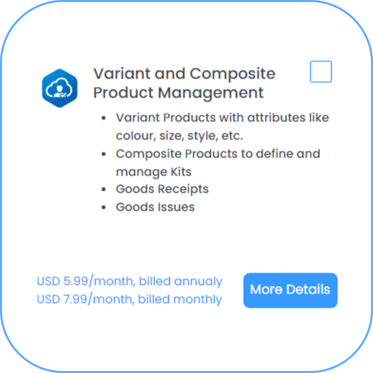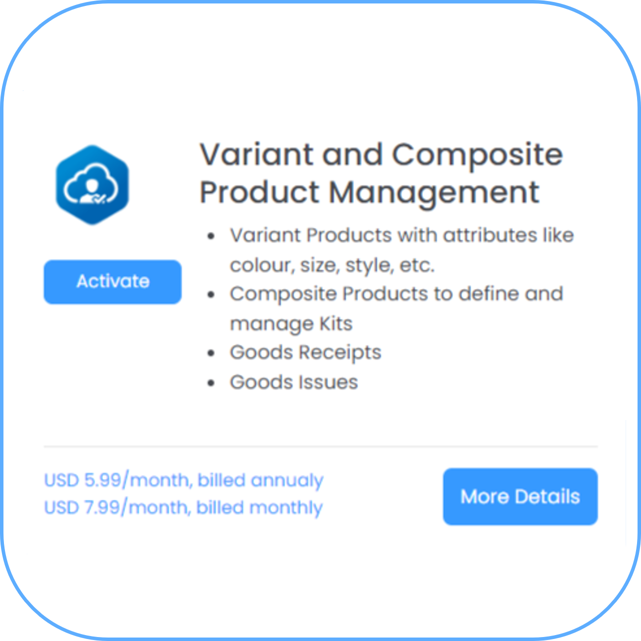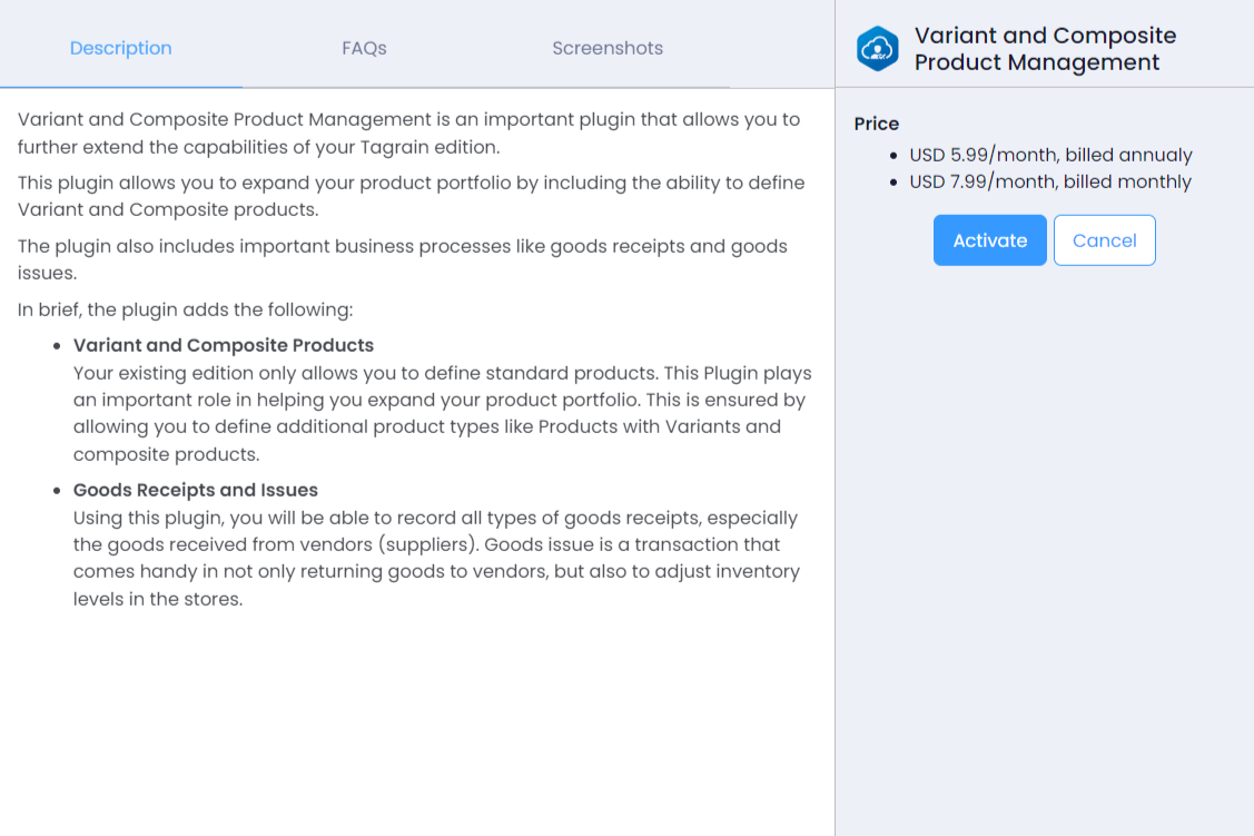 You can subscribe to and activate plugins depending upon the needs of your business. Plugins allow you to increase your application landscape based on the demands and growth of your business. The application grows with your business.
