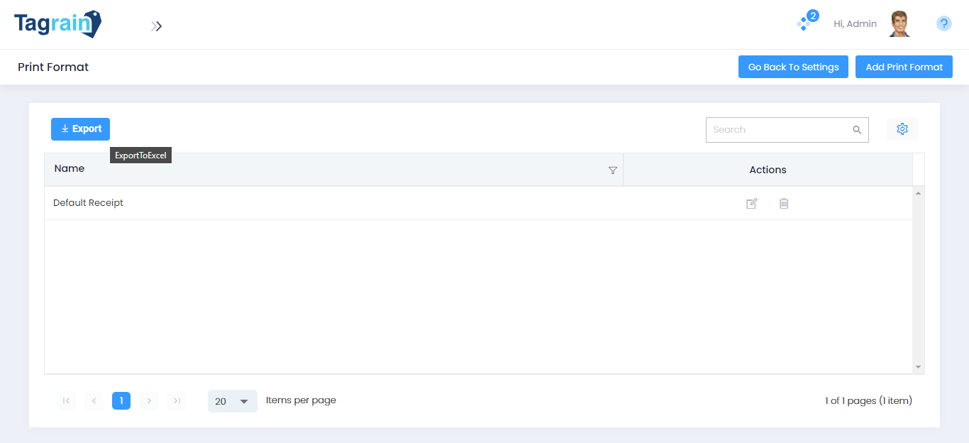 To know the total number of Receipt Templates that you are dealing with, when managing the Tagrain application, you can make use of the excel based export template. This allows you to view the Receipt Templates. This feature is useful for managers and administrators who are responsible for application management.