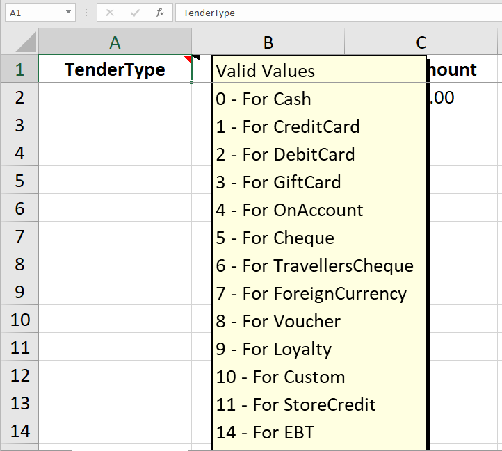 Tender Type | This field displays the type of tender. The available values are: 1 – For Credit Card, 2 – For Debit Card, 3 – For Gift Card, 4 – For On Account, 5 - For Cheque, 6 – For Traveller’s Cheque, 7 – For Foreign Currency, 8 – For Voucher, 9 – For Loyalty, 10 – For Custom, 11 – For Store Credit and 14 – For EBT. |