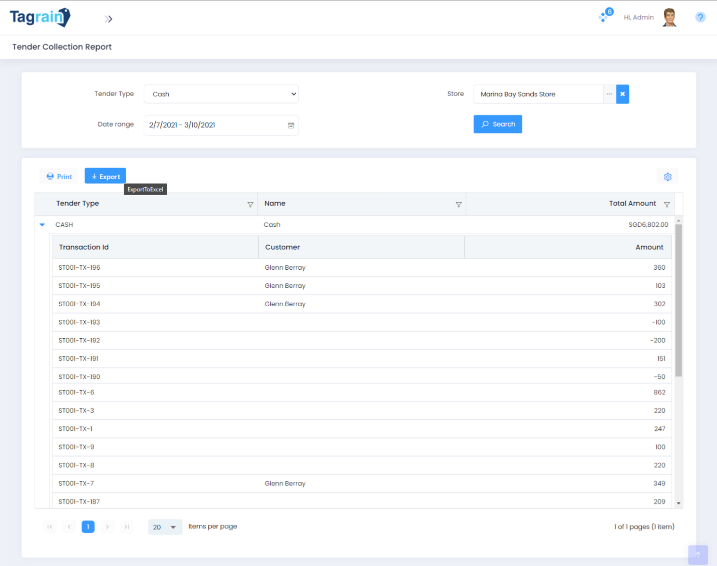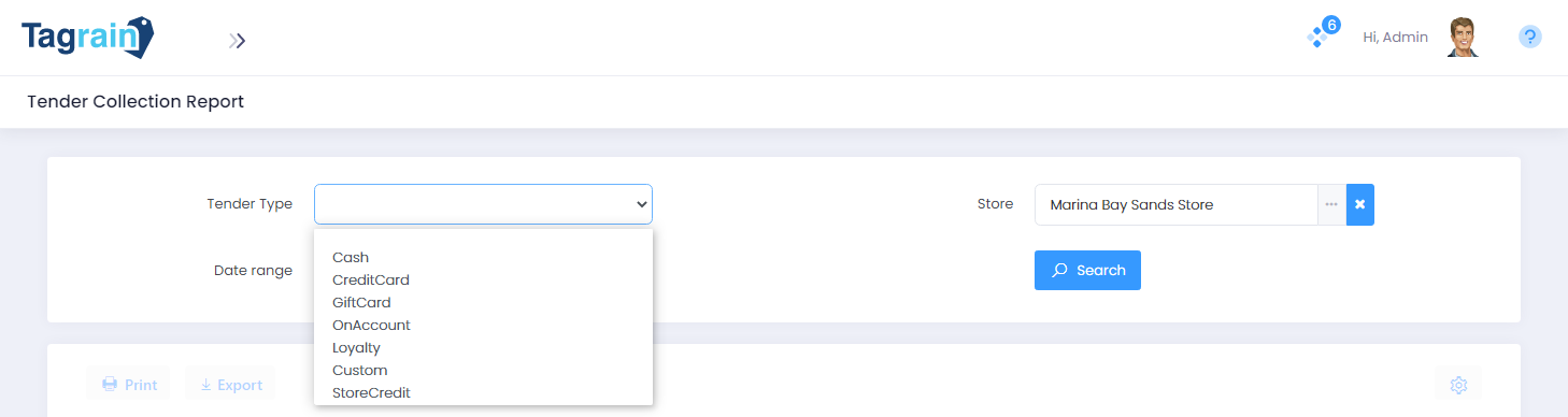 To generate a snapshot of the total tender collected by a store, when managing the Tagrain application, you can make use of the excel based export template. This allows you to review and analyze the total tender collection done by the selected store, for the date range specified. This feature is useful for managers and administrators who are responsible for application management.