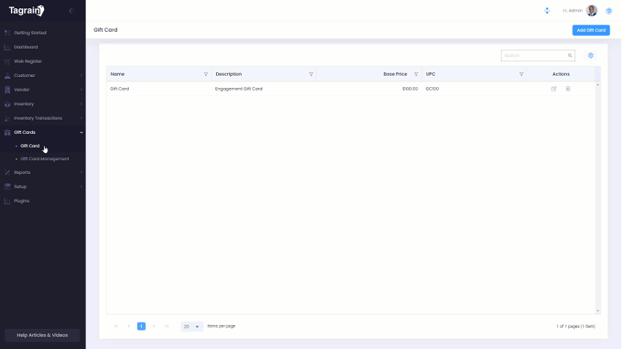 Gift Cards are used as a payment type in sales and refund transactions. A Gift Card in Tagrain has a unique number associated with it. Depending on the customer's preference, it can either be redeemed partially or in full. Tagrain Gift cards can also be used as store credit.