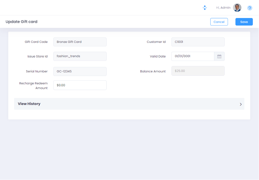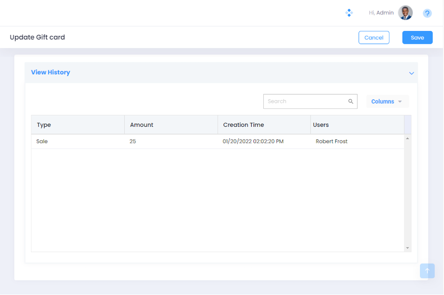 This section allows you to view the existing gift cards in the application. Here you can see which gift cards have been issued and what is their balance amount. In addition to this, you can see their usage history.