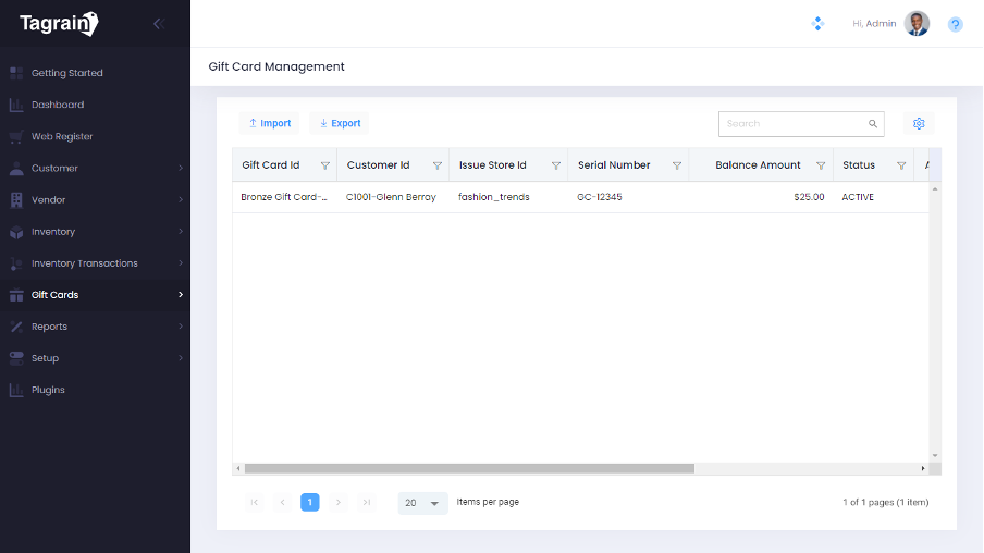 The serial number of the gift card can be seen. This is the serial number that was set to the gift card when it was sold from the POS.