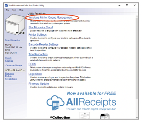 Install the drivers for your Star Micronics printer. This is required specially if you are connecting your printer using an interface other than USB. You can make use of the “Windows Printer Queue Management” function to install drivers for an interface other than USB.
