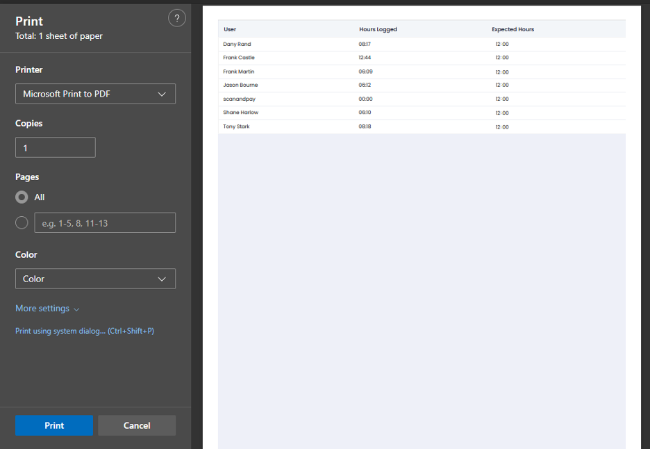 Hours Worked Report can be printed using the "Print" button. The steps to print a Hours Worked Report are explained below: