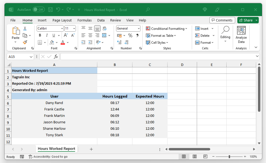 Let’s try to understand this with an example. A user Frank Martin is scheduled to work for 9 hours in a day and is rostered to log in at 9:00AM and log out at 6:00PM. The Hours Logged for Frank Martin will be calculated from the time he logs in to the time he logs out. Now if Frank Martin logs in at 10:00AM and logs out at 5:00PM, the Hours Logged for Frank Martin would be 7 Hours and Expected Hours would be 9 Hours.