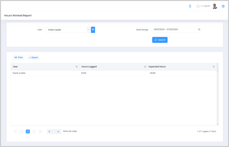 The Hours Worked Report is used for reviewing and monitoring the hours a user has logged in. It records the total time (in hours) that a user has logged in and displays the Expected Hours as per the schedule defined in the roster.