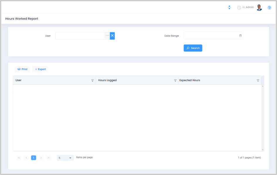 Step 4. Click the Search button to generate the Hours Worked Report. The Hours Worked report will display the time a user was logged in (in Hours) and the time that user was expected to work (in Hours), in the specified date or date range.