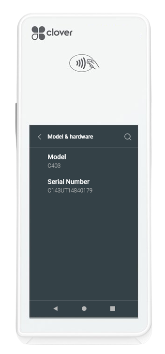 Navigate to: Settings > About Device > Model & hardware, to obtain the Clover Device ID. The image below depicts a Clover Flex device displaying the Model & Serial Number of the device.