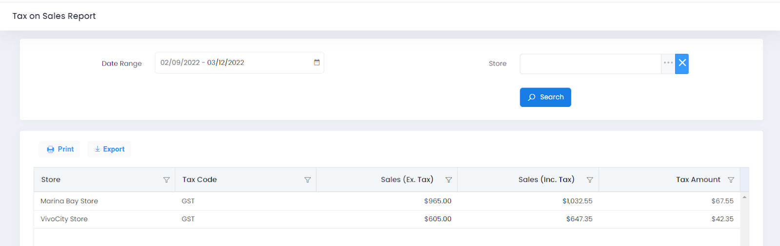 Tax on Sales Report can be Printed using the "Print" button. Click on the Print button, Print Preview pops up, select the destination printer, pages, Copies, Color and configure more settings, if required. Click on the Print button to print the Tax on Sales Report.