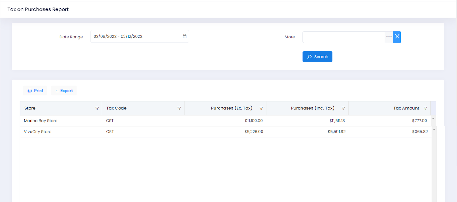 Go to Home > Reports > Tax on Purchases Report. On clicking the Tax on Purchases Report, the report gets populated for all the stores. You can choose to generate the report individually based on the Store. To selectively filter the report, perform the following steps: