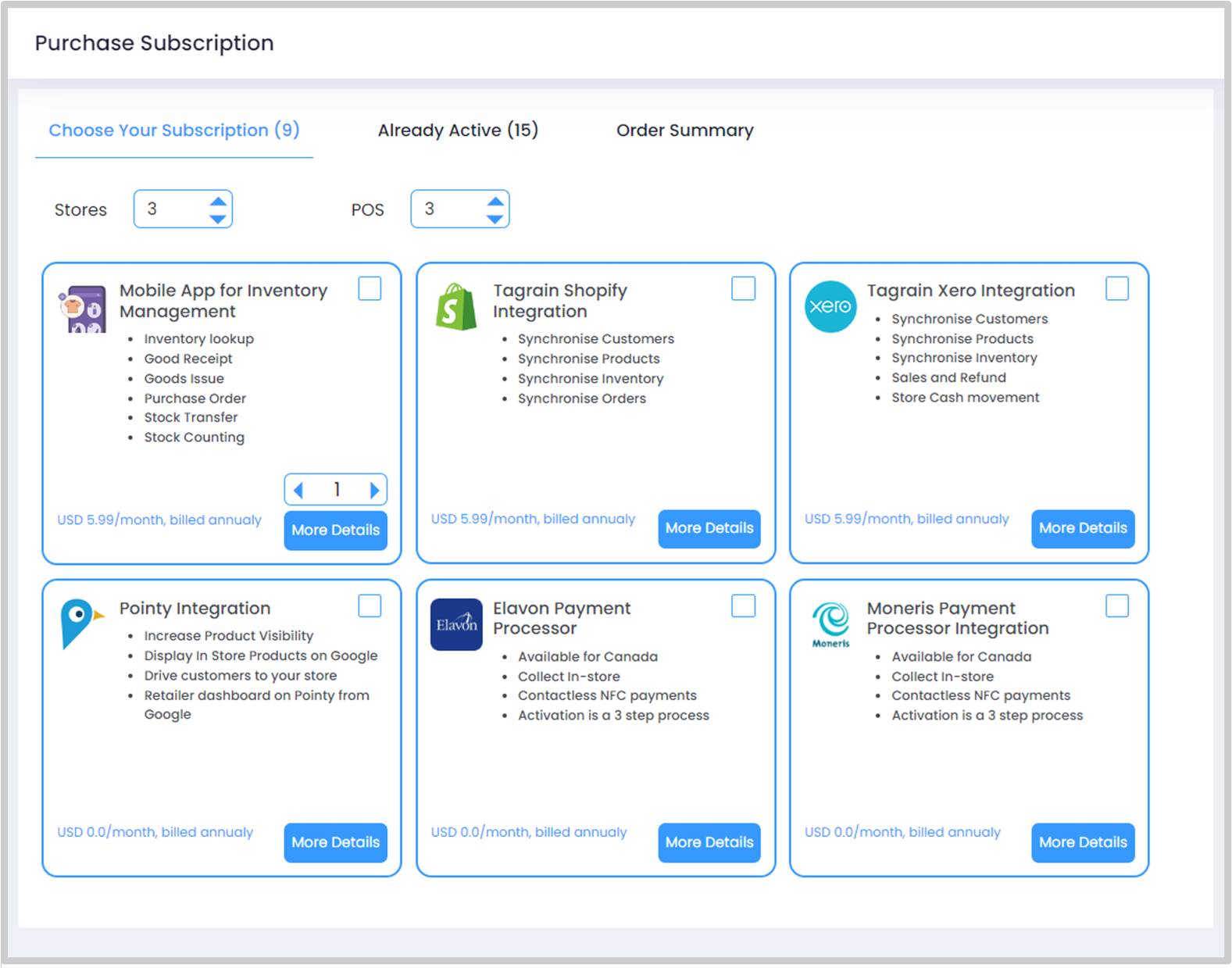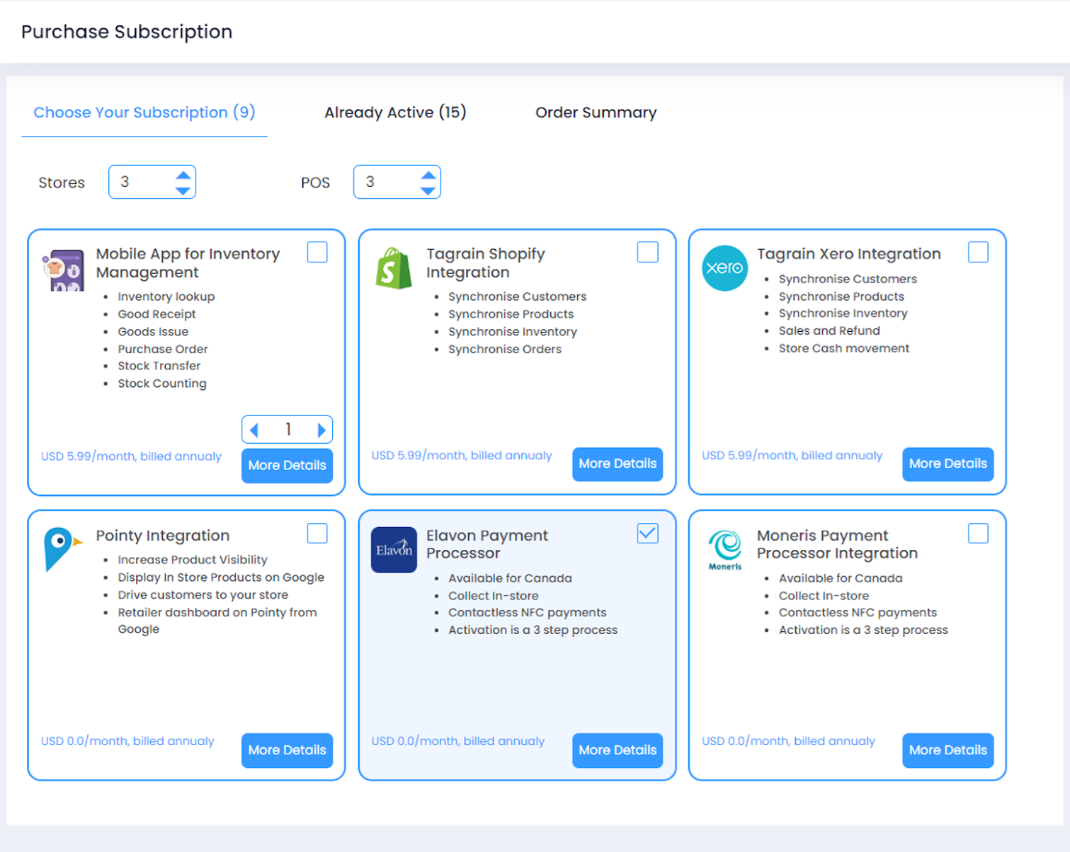 Step 3. Navigate to the Choose Your Subscription section on the Purchase Subscription page. You should see the Elavon Payment Processor plugin unselected. You simply need to put a tick against the activation check box on the Elavon Payment Processor plugin Tile to mark the plugin as Active.