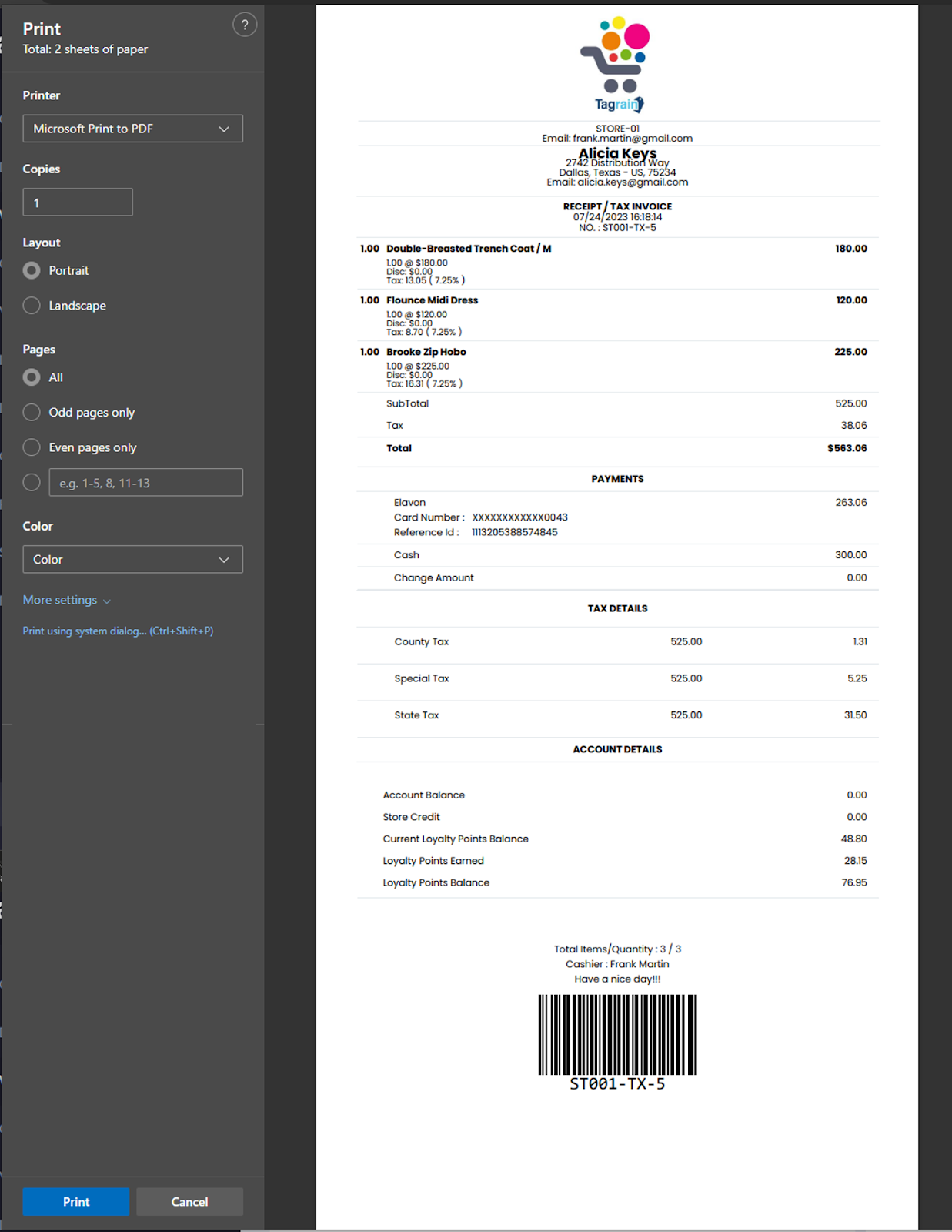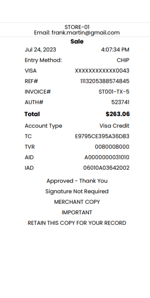 A sale transaction receipt is printed upon successful payment and would reflect the amount paid using Elavon as the payment method along with other payment methods.