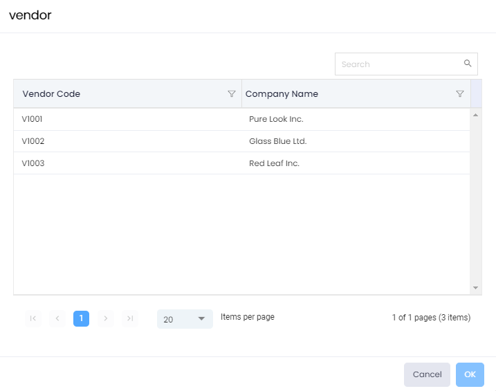 Type in the Customer Name or the Vendor Name. Alternatively, click on the […] to pick a customer or a vendor from the list available. This setting depends upon the Business Partner Type selection made above. In this example we have selected V1003 - Red Leaf Inc, as our Vendor.